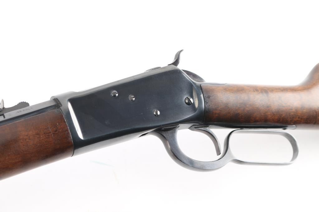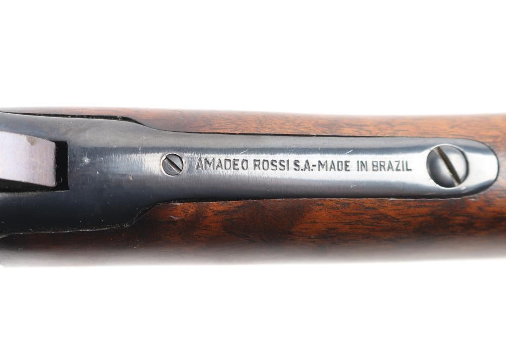 Brazilian made lever action rifle chambered for .45 Colt cartridges. It features a 24" blued octagon/round barrel and receiver, pinned brass blade front, rear sporting sights, full length magazine tube, serrated hammer spur and smooth trigger. The smooth wood stocks have a steel cap on the forearm and a smooth metal crescent butt plate. Blue finish is about 98% with minor scratches. Nicely grained wood stocks look very good with minor signs of handling. Bore is excellent/bright. Action is smooth.