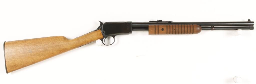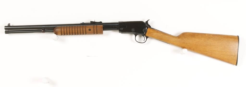 Brazilian made pump action exposed hammer rimfire rifle based on the Winchester model 62 with 16-1/2" barrel. Blued finish, plain straight grip wood stock, grooved pump handle, full length tube magazine and open sights. Good bore and action. Condition: Very good showing little use. *Modern Firearm*