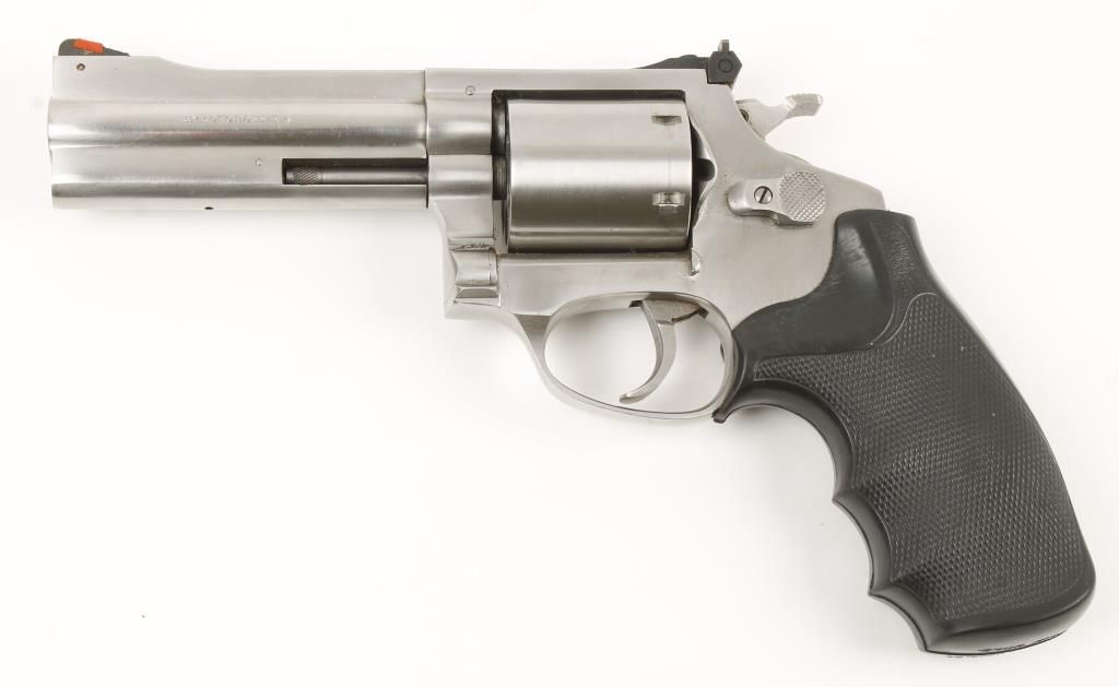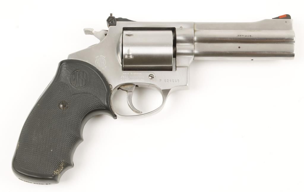 Brazilian made double action 6 shot revolver with 4" barrel. Stainless steel, checkered black rubber grips, red insert front sight, adjustable rear sight, non fluted cylinder and full length underlug. Good bore and action. Condition: Good overall showing light wear. Needs cleaned. *Modern Firearm*