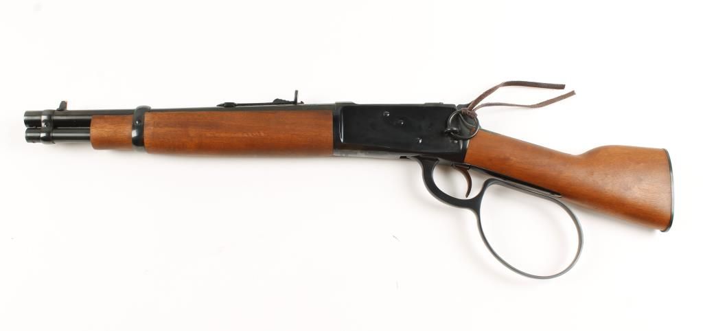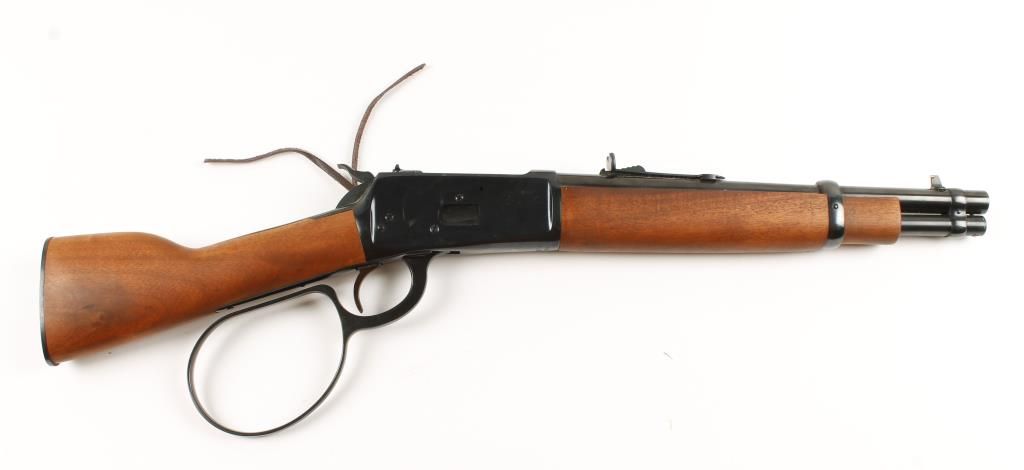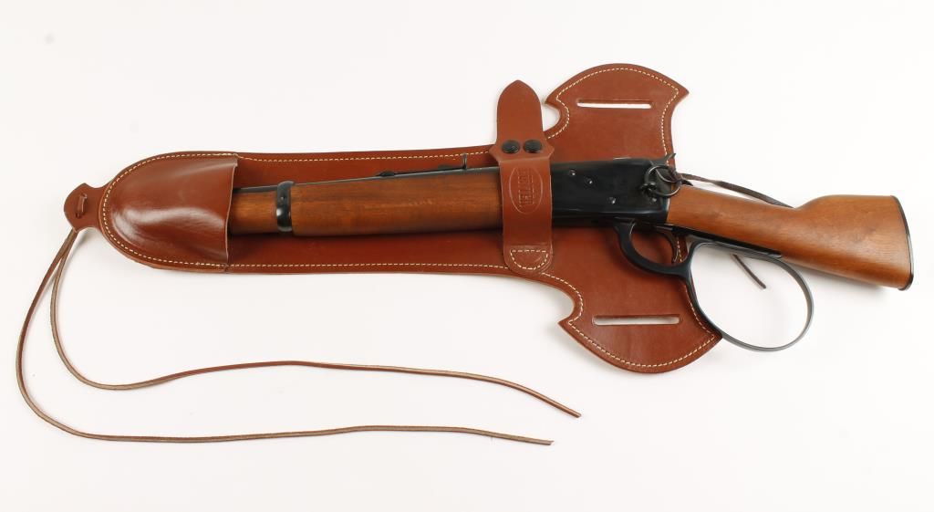 Lever action "pistol" with 12" barrel, full length tube magazine, straight grip wood handle and forend, saddle ring, large loop lever, and open sights. Very good bore and action. Includes Hunter brand leather holster. Condition: Very good showing very little use. *MODERN FIREARM*