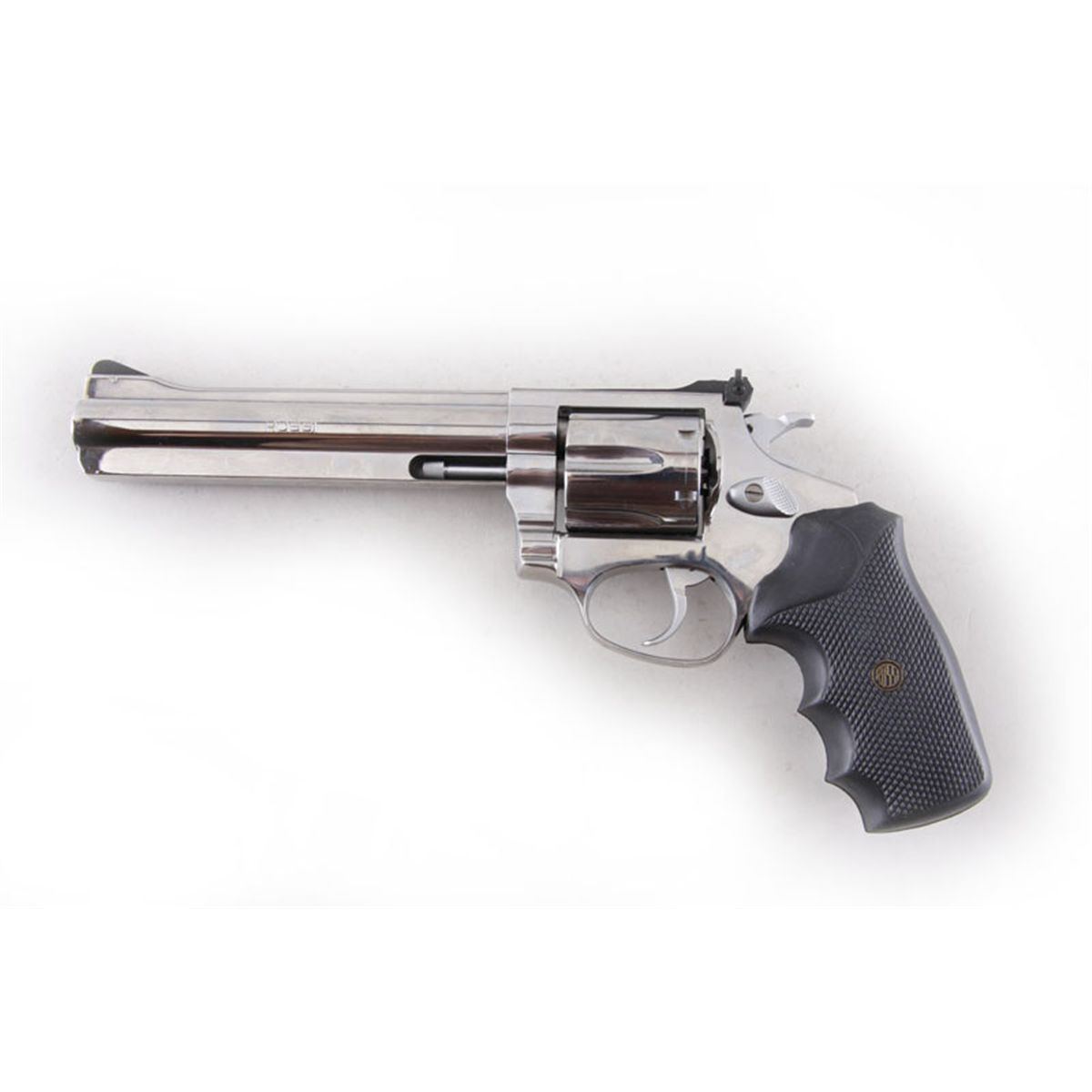 Rossi Mdl R972 Cal .357mag SN:ZF404622 Double action 6 shot target revolver made in Brazil by Taurus. Polished stainless steel construction, black rubber checkered grips, 6" barrel with adjustable sights, internal lock in the hammer, good bore and actioDouble action 6 shot target revolver made in Brazil by Taurus. Polished stainless steel construction, black rubber checkered grips, 6" barrel with adjustable sights, internal lock in the hammer, good bore and action. Inoriginal black box with instructions, and key. Condition: Near new with no sign of use. 'NOT CALIFORNIA LEGAL"