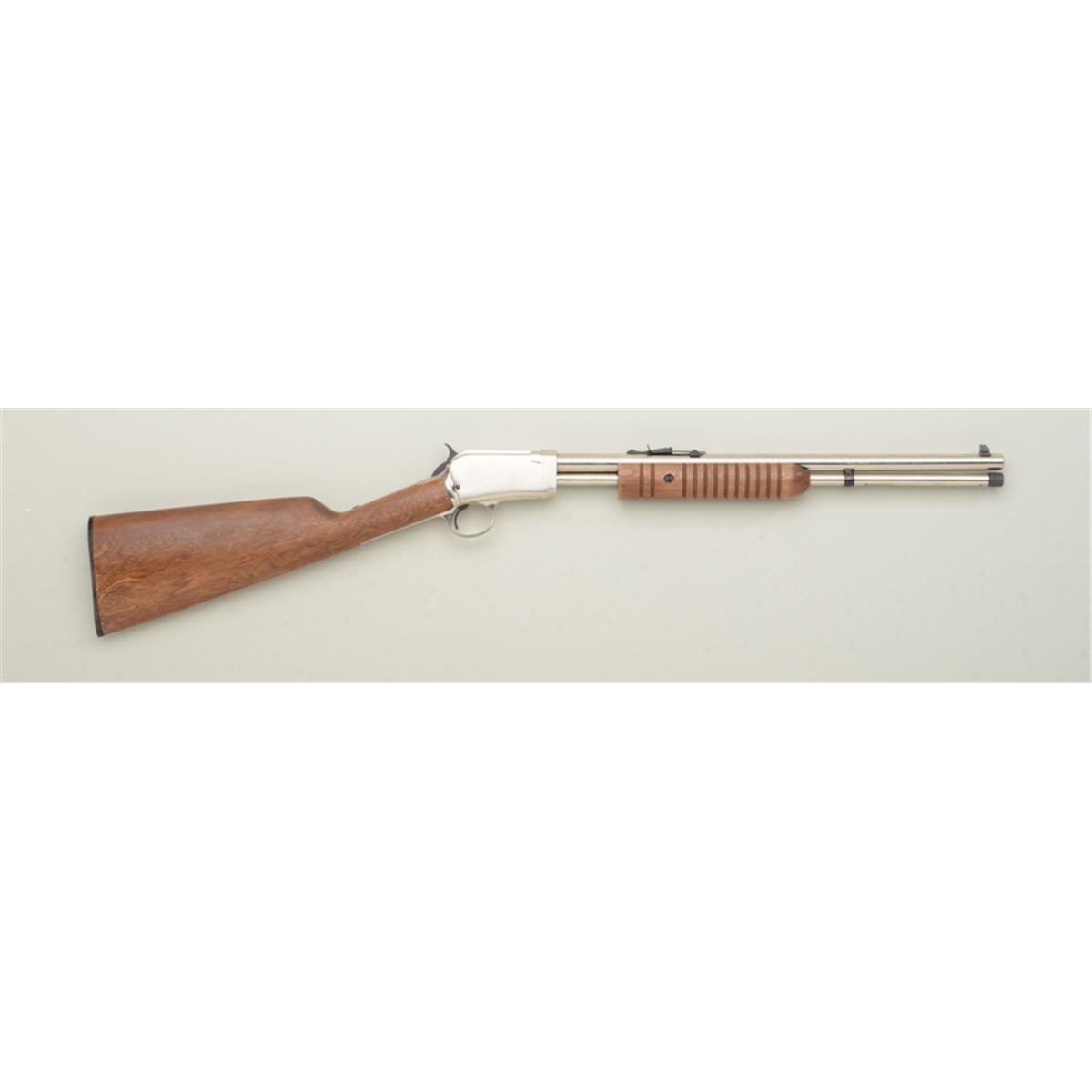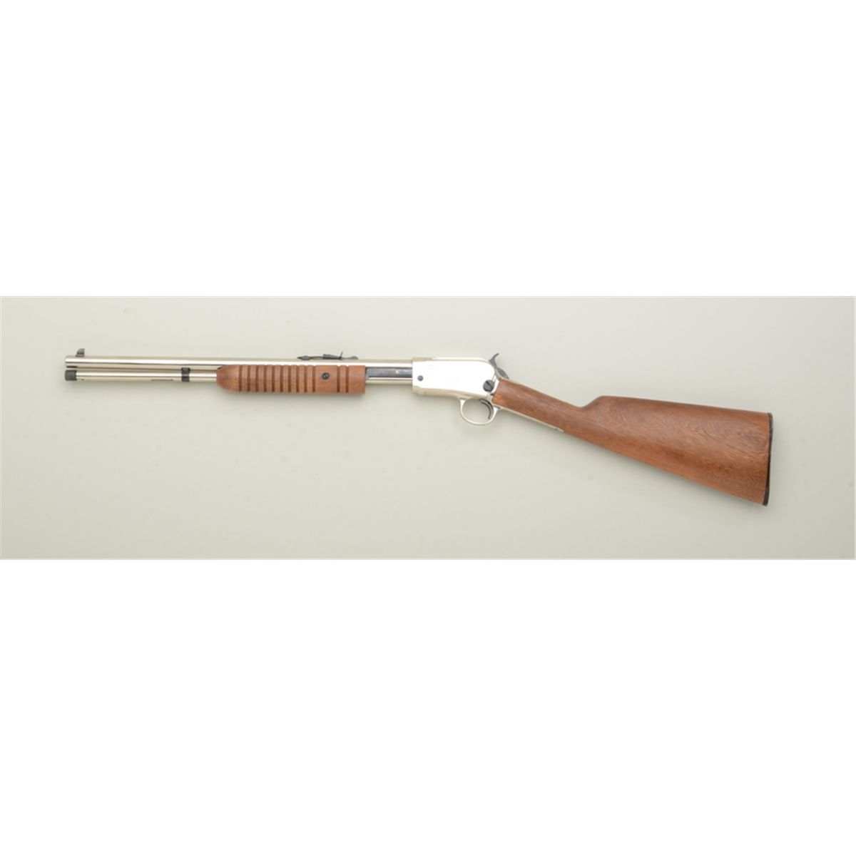 Rossi Model 62 Gallery Jr. pump action rifle, .22 short, long and long rifle cal., 16-1/2” barrel, nickel finish, wood stocks, #G357979. This gun is in like new condition in its factory cardboard box numbered to this gun. Est.: $100-$200.