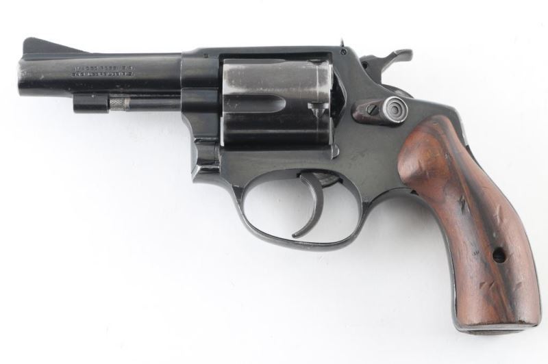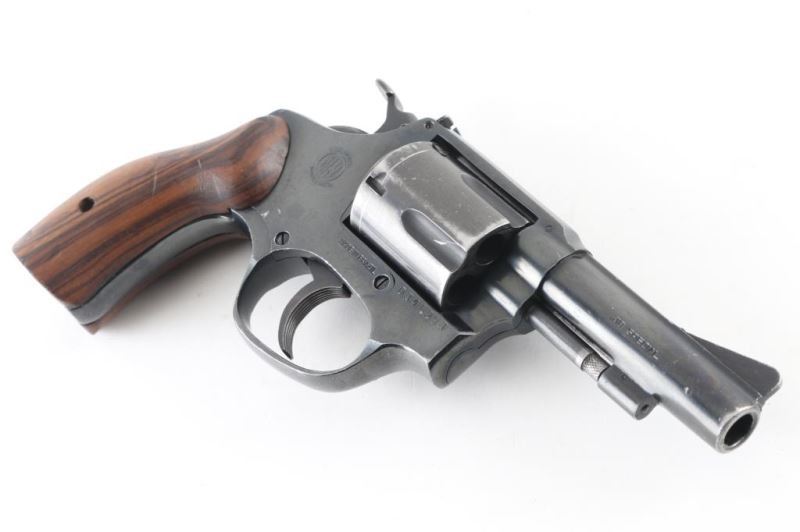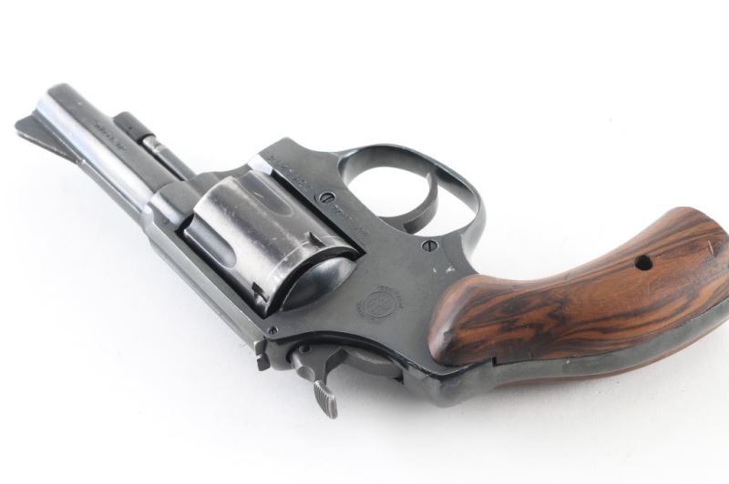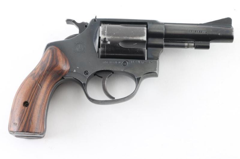 Brazilian revolver imported by CAI, St Albans VT. Features blued finish, smooth wood grips, 3" barrel, ramp front sight, rear sigh adjustable for windage, 5 shot fluted cylinder. Bore is very good. Retains 65% finish with bare metal on edges & around cylinder. Grips are good condition, fair fit to frame, a bit loose, with dents & scratches. Action is smooth with good lock-up. Condition is NRA Very Good *** Modern Firearm ***