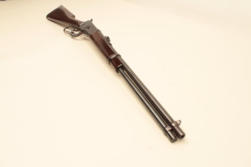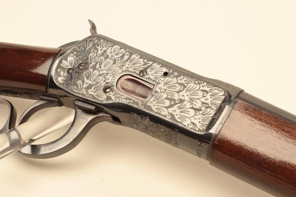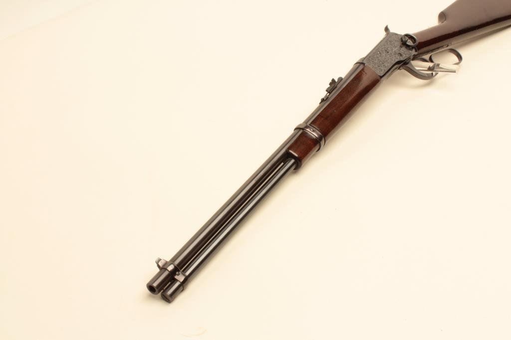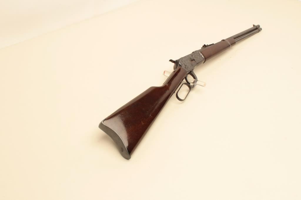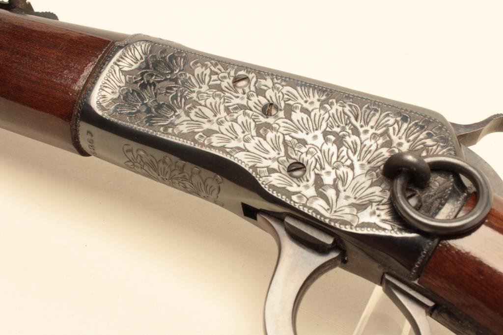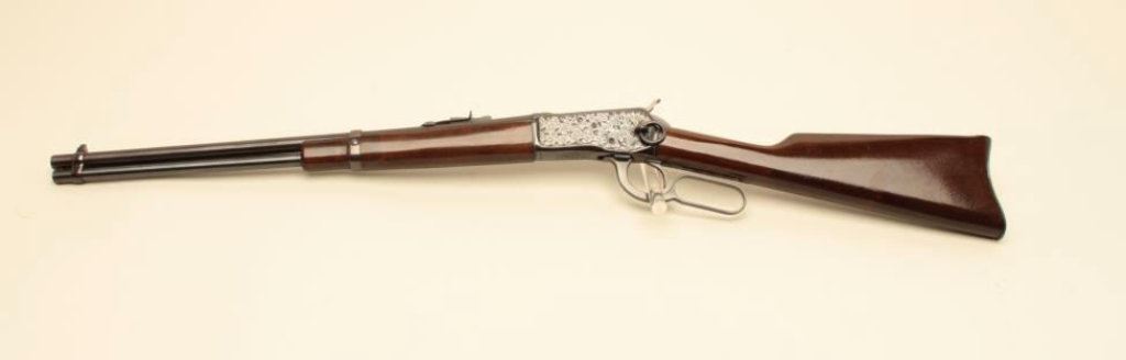 #K 029267. The carbine is in very good overall condition with a 20” barrel. The barrel and full-length magazine retain nearly all of their blued finish with only light handling marks. The receiver is engraved with a floral pattern, retains nearly all of its blue finish and retains the saddle ring. The smooth wood stocks are in good overall condition with some small mars and storage marks. The butt ends with a smooth steel crescent butt plate which is slightly proud at the toe. The bore is very good, the action crisp and markings are sharp. Est.: $300-$600. (Modern).