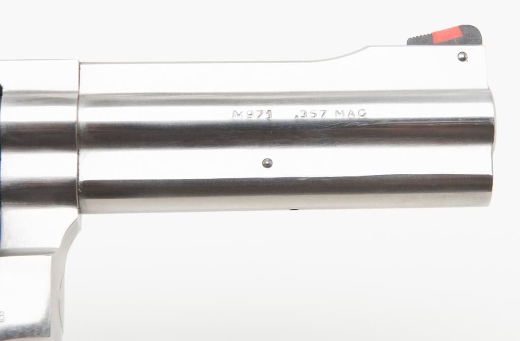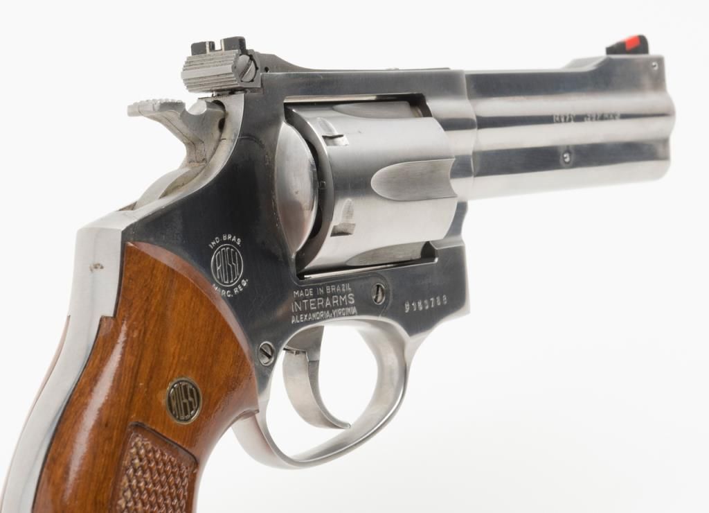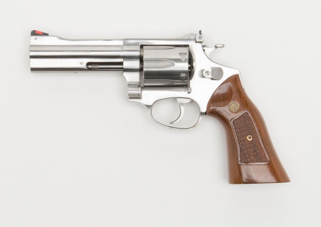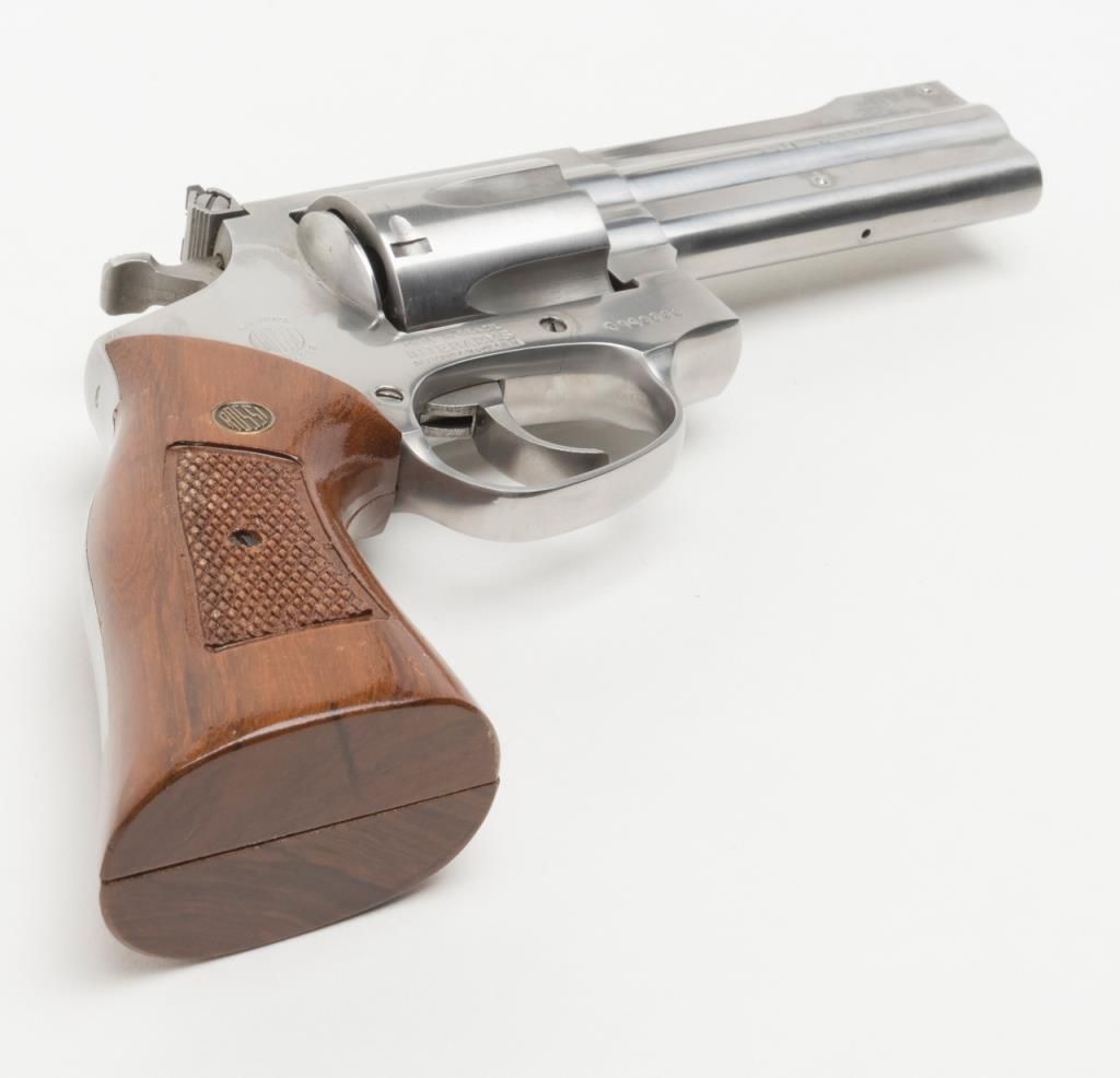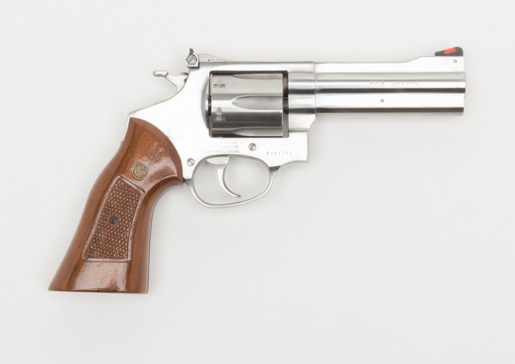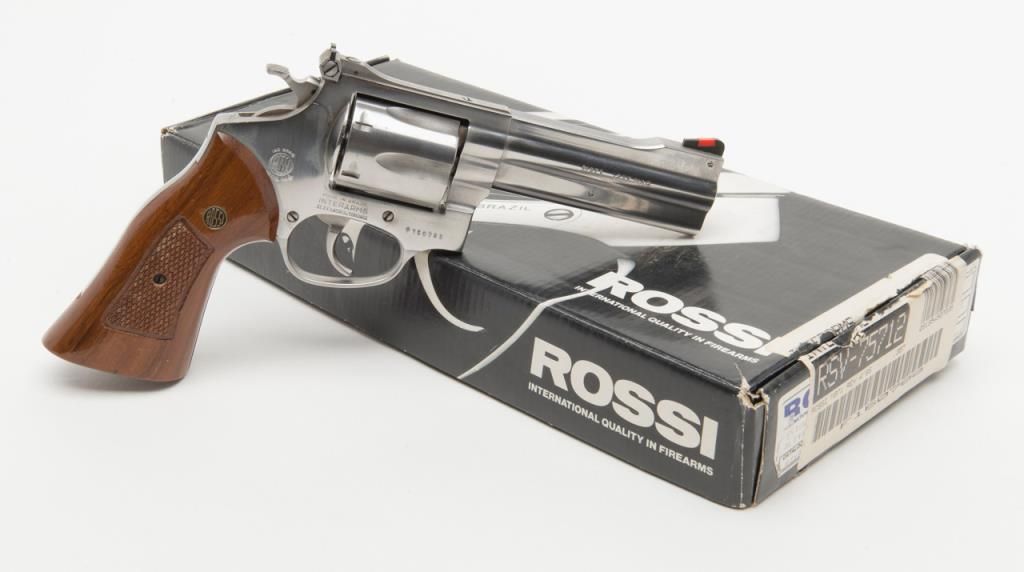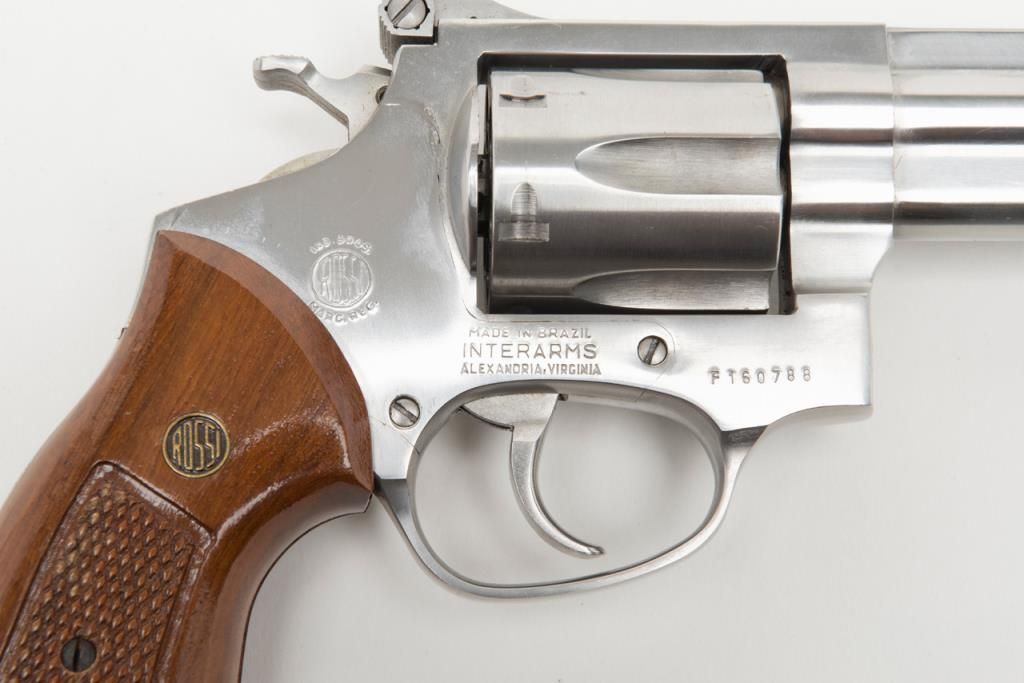 Rossi Model 971 DA revolver, .357 Magnum cal., 4” barrel, stainless, checkered wood combat grips, #F160788 in overall fine condition with a fine bore, crisp action, sharp markings and fine grips; accompanied by a factory cardboard box with endlabel numbered to this gun. (Modern/PPT). Est.: $200-$400.