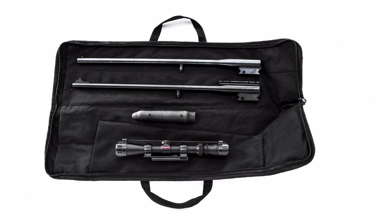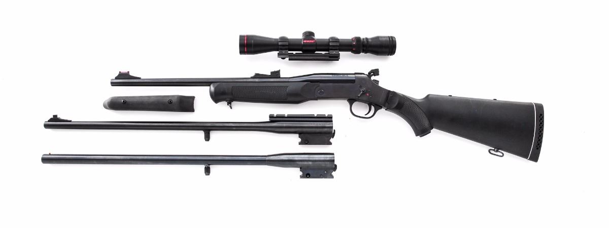 Rossi Pick 4 Youth Gun Single Shot Break Action Rifle, #S2022243YBS, .22 LR/20 ga./.243 cals., 18.5'' barrel, blue finish, checkered black composite stock, red ramped dot front sight and green two-dot rear sight. Includes three (3) barrels: (1) .22 LR, (2) 20 ga. shotgun, (3) .243 Win. cals. With Simmons 3x-9x scope in Weaver mounts (needs longer screws to mount properly). Condition is excellent retaining nearly all of its original finish. Stock is excellent. Action is tight, bores are bright. Est.: $300-$450. (Modern)