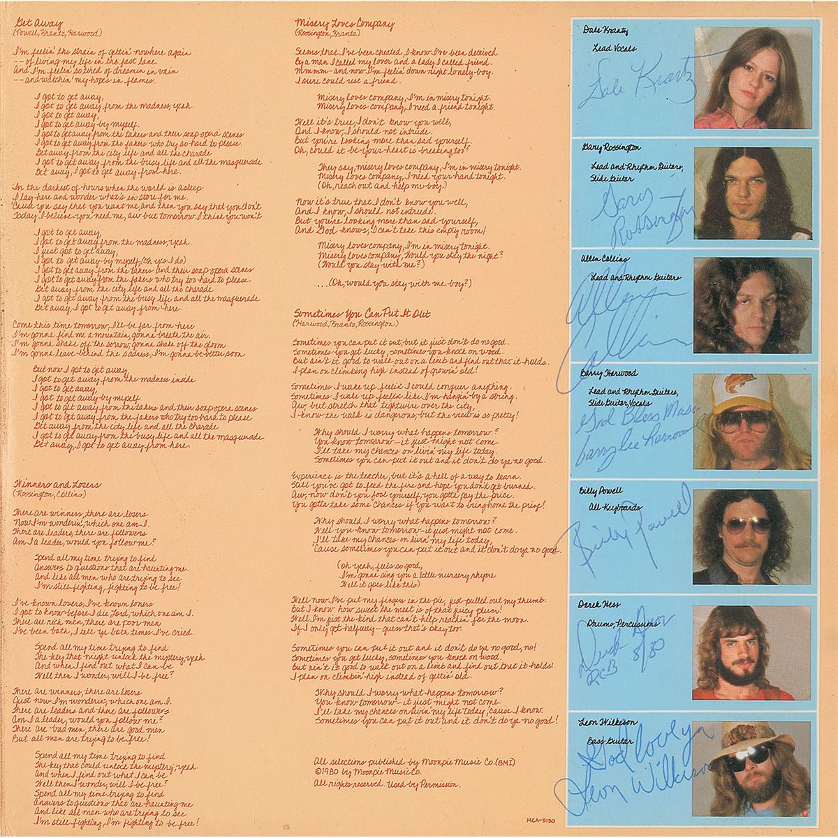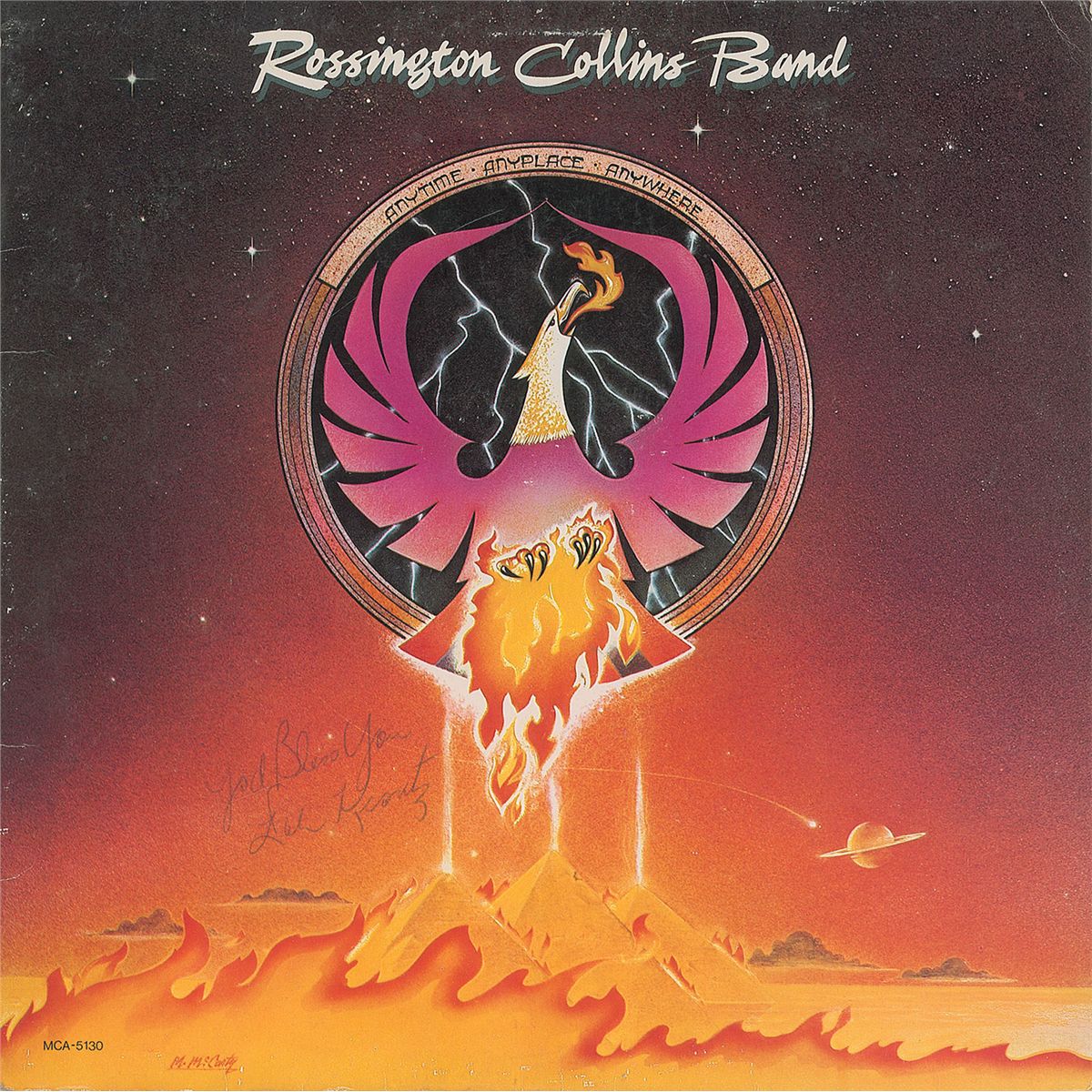 Anytime, Anyplace, Anywhere album signed on the front cover in ballpoint by Dale Krantz, and signed on the inside gatefold by Krantz, Gary Rossington, Allen Collins, Barry Lee Harwood, Billy Powell, Derek Hess, and Leon Wilkeson. In fine condition. The record is included. The band was formed in 1979 by former Lynyrd Skynyrd members Rossington, Collins, Powell, and Wilkeson, all of whom had survived the tragic 1977 plane crash that killed three members of the group.