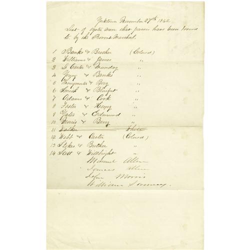 <B>Roster of African-Americans Receiving Federal Passes.</B></I> Manuscript document, "<I>list of oyster men that passes have been issued to by the Provost Marshal.</B></I>", one page with verso docketing, 7.75" x 12.5", Yorktown, Virginia, November 27, 1862. Thirteen pairs of "<I>colored</B></I>" men and four individuals are noted here on this scarce Yankee document. One white man was listed; however, his name has been stricken from the list. Overall light browning as expected, one small split along a horizontal fold. Very good condition.<BR><BR><b>Shipping:</b> Small Flat (<a target="_blank" href="http://www.heritageauctions.com/common/shipping.php">view shipping information</a>)