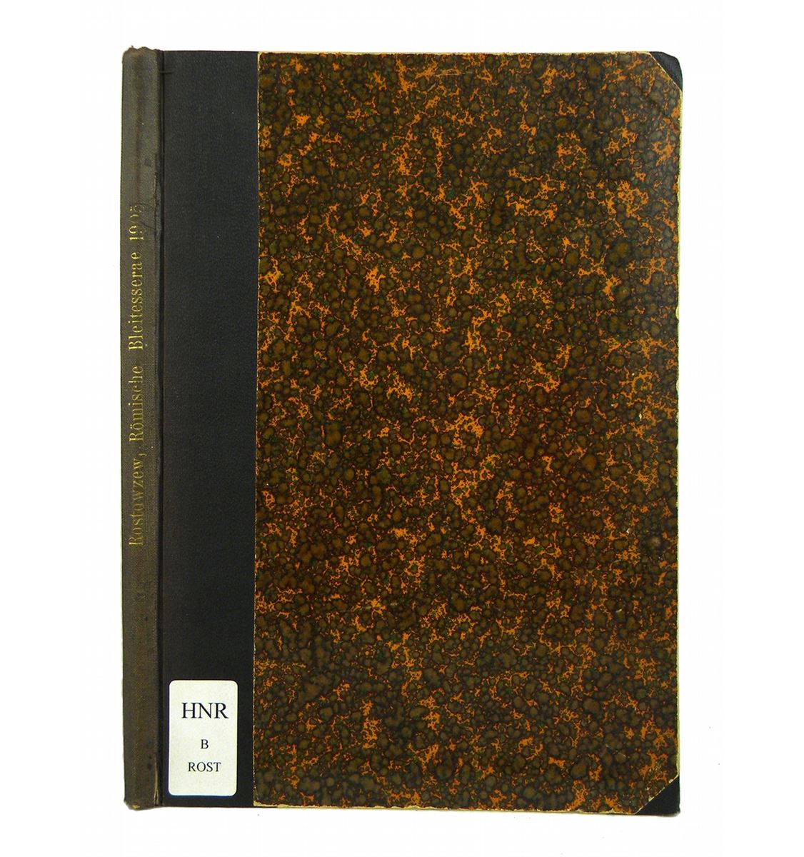 Rostowzew, M. RÖMISCHE BLEITESSERAE. EIN BEITRAG ZUR SOZIAL- UND WIRTSCHAFTGESCHICHTE DER RÖMISCHE KAISERZEIT. Leipzig: Dieterich'sche Verlagsbuchhandlung, 1905. 4to, contemporary brown cloth-backed mottled boards, gilt. ix, (3), 131, (1) pages; 2 plates. Library stamps and labels to cover, endpapers and title, but not affecting text or plates. Very good. The rare original edition.
