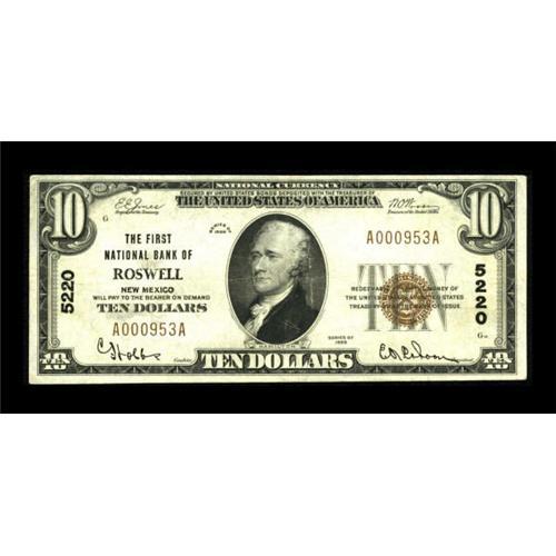 <B>Roswell, NM</B></I> - $10 1929 Ty. 1 <B>The First NB</B></I> Ch. # 5220<BR> A <B>Very Fine</B></I> $10 Type 1 from a state that never seems to have enough available notes to satisfy the demands of the collecting community. Tonight's example retains much of its original crispness. For this bright example we anticipate that the final realization will be in the range of...<BR><I>From The Kansas City Collection.</B></I><BR><BR><b>Shipping:</b> Coins & Currency (<a target="_blank" href="http://www.heritageauctions.com/common/shipping.php">view shipping information</a>)