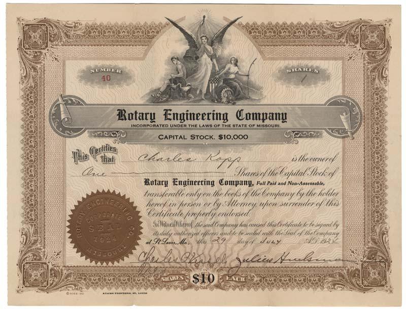 1924, Missouri. Stock certificate for 1 share. Brown/Black. Vignette of allegorical figures. Uncancelled and fine. Litho