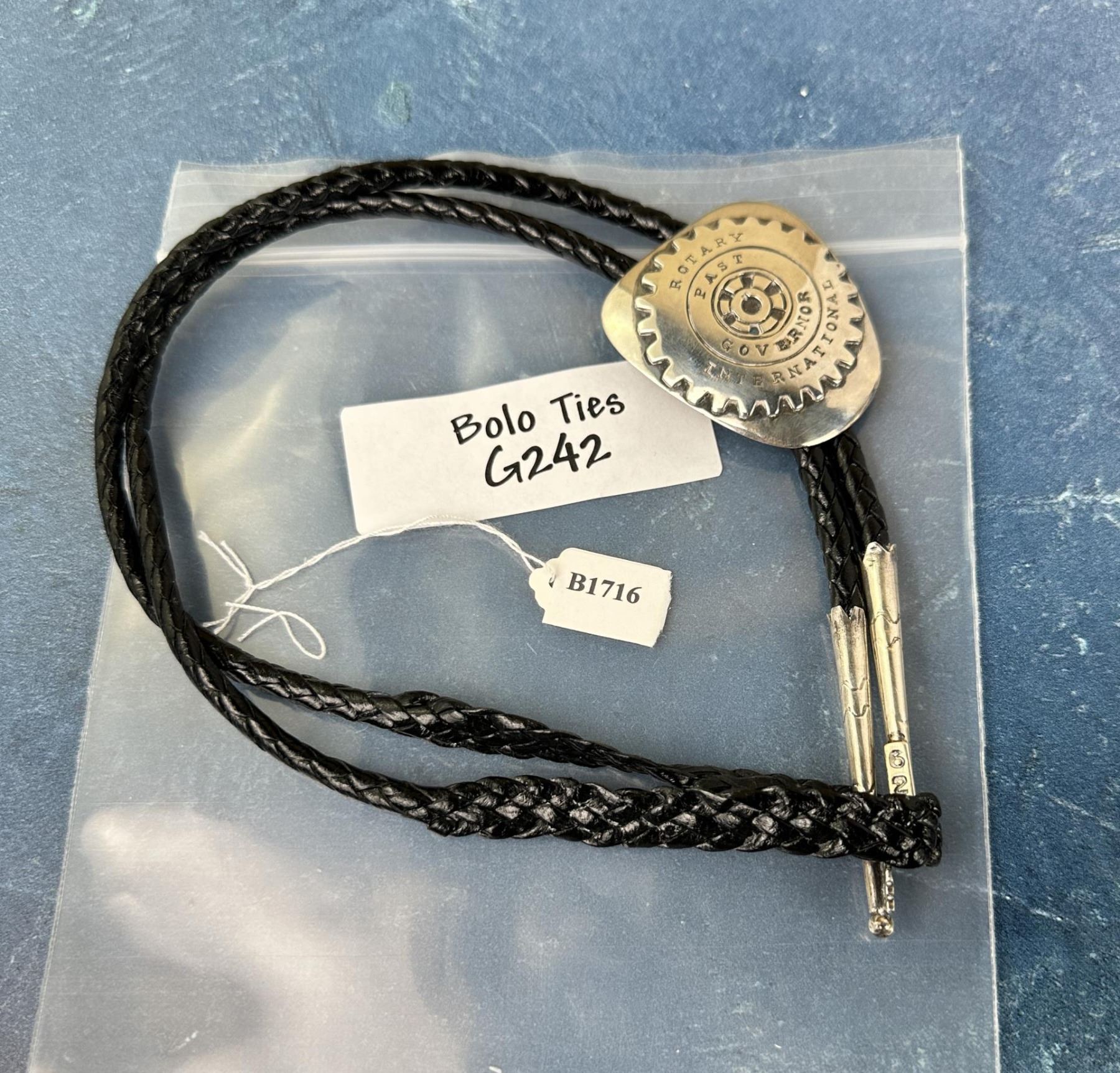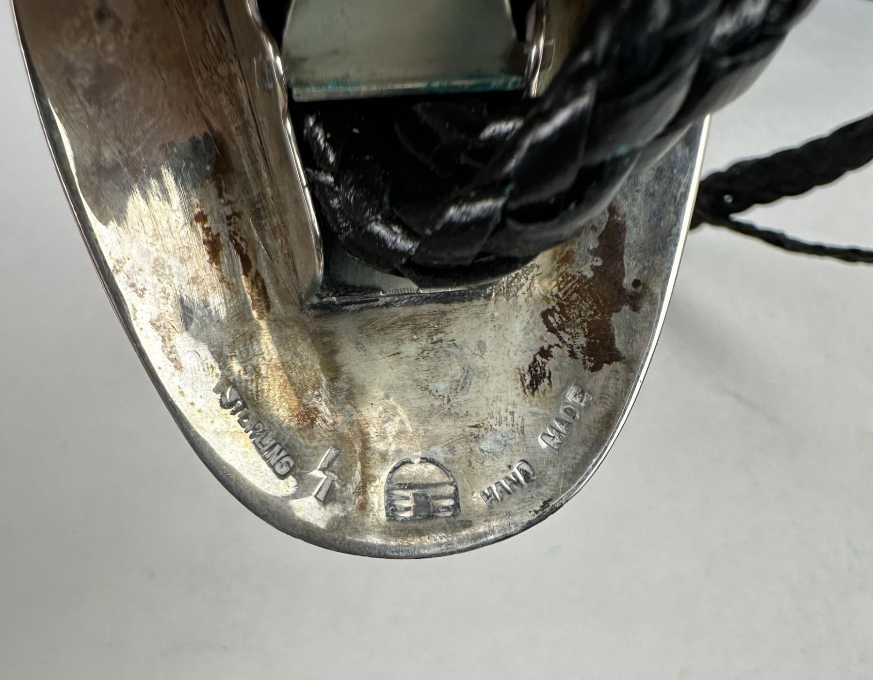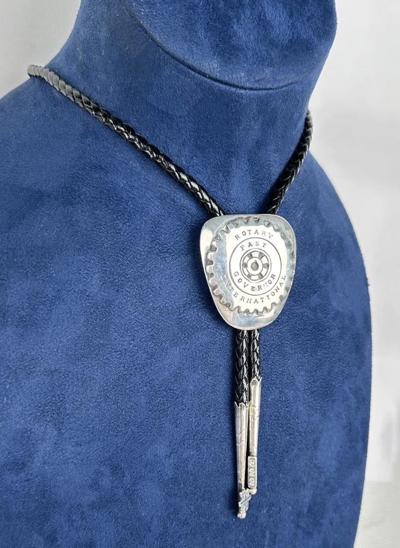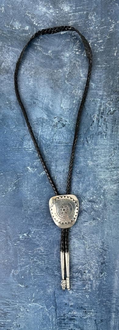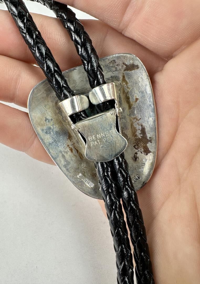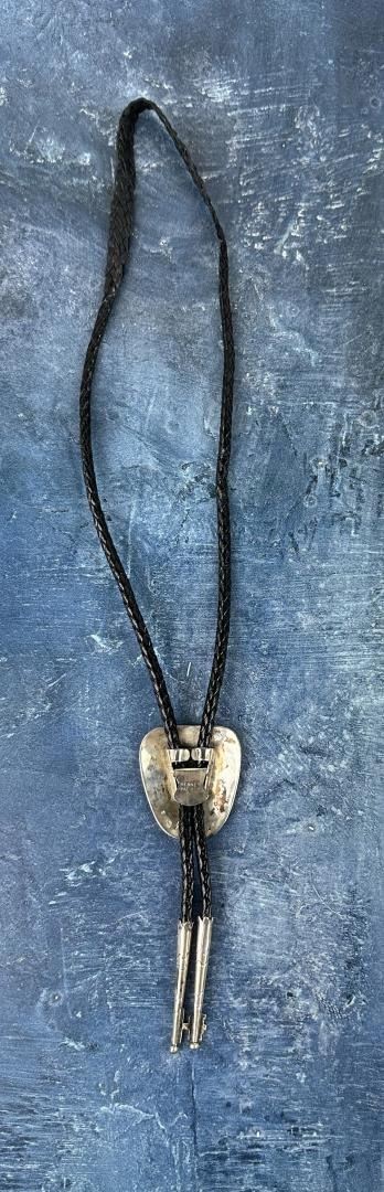 Bolo Tie is stamped with the mark for Leroy Thomas and The White Hogan Silver Co. Measures 17" long. Slide is 1 3/4" wide. Norman Sandfield Collection Inv: B1716