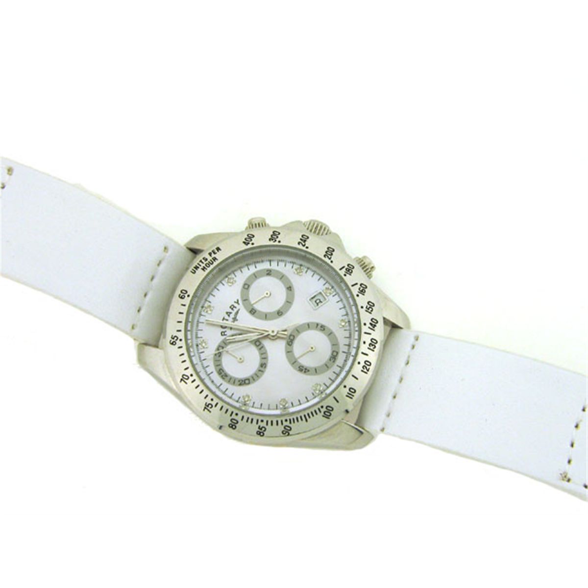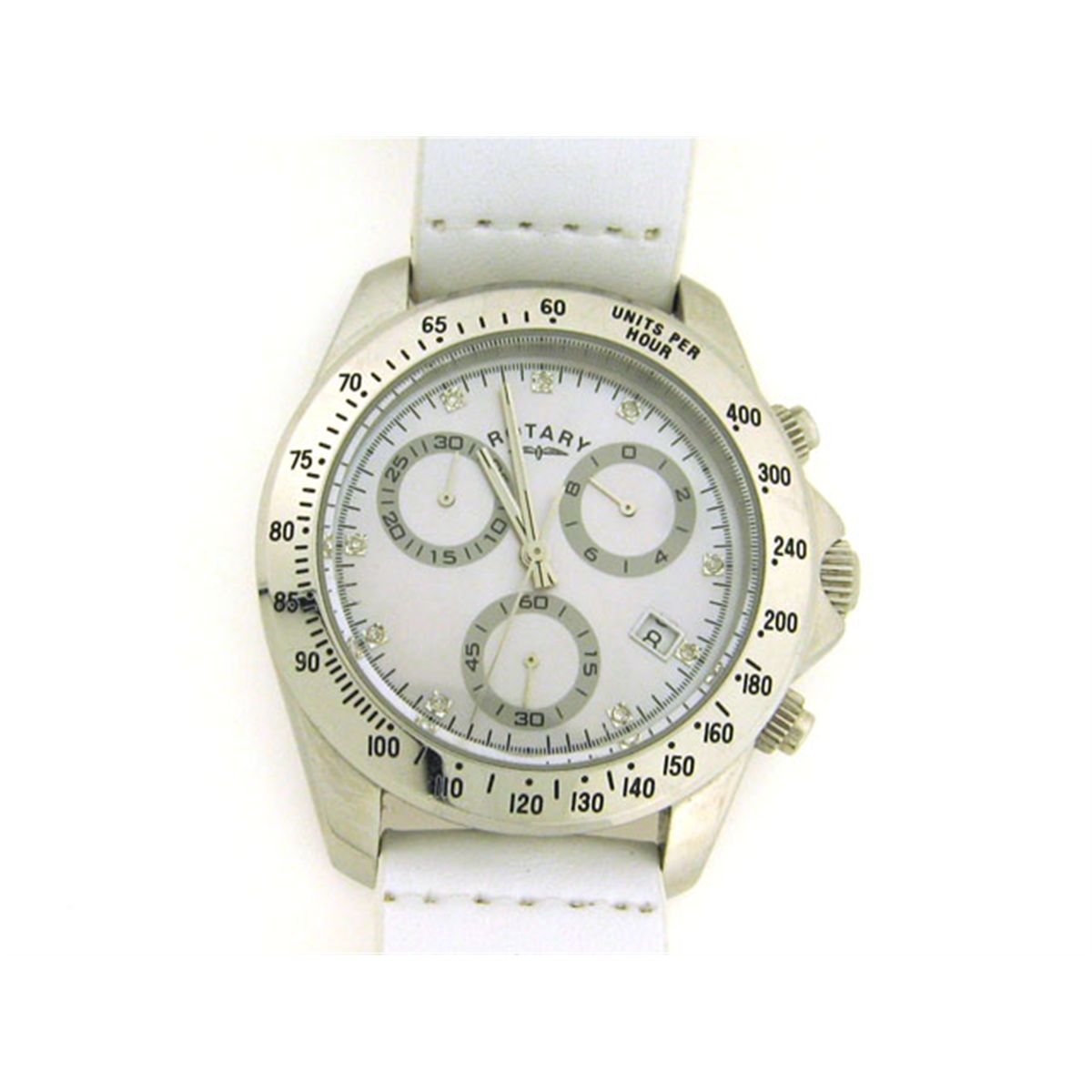 This is a Rotary Ladies Stone Set Mother of Pearl Chronograph Watch l Watch with the following features: Polished Steel Case & Bezel 40mm wide; Mother of Pearl Dial With Double Crystal Hour Markers; Three Chronograph Sub Dials; Mineral Glass lens; and Water Resistant to Dolphin Standard 100m