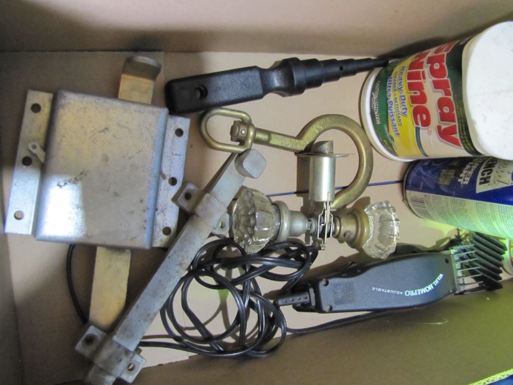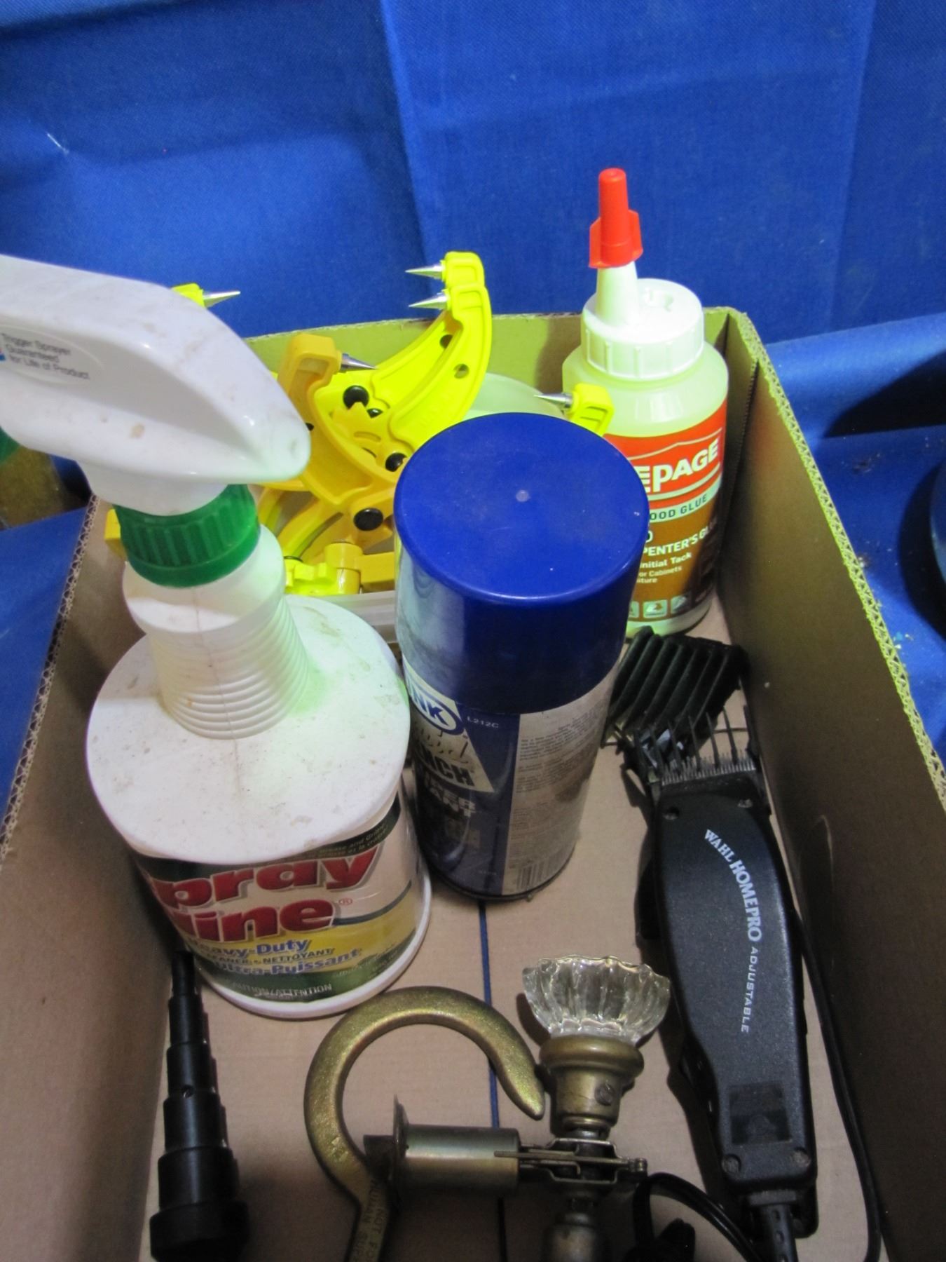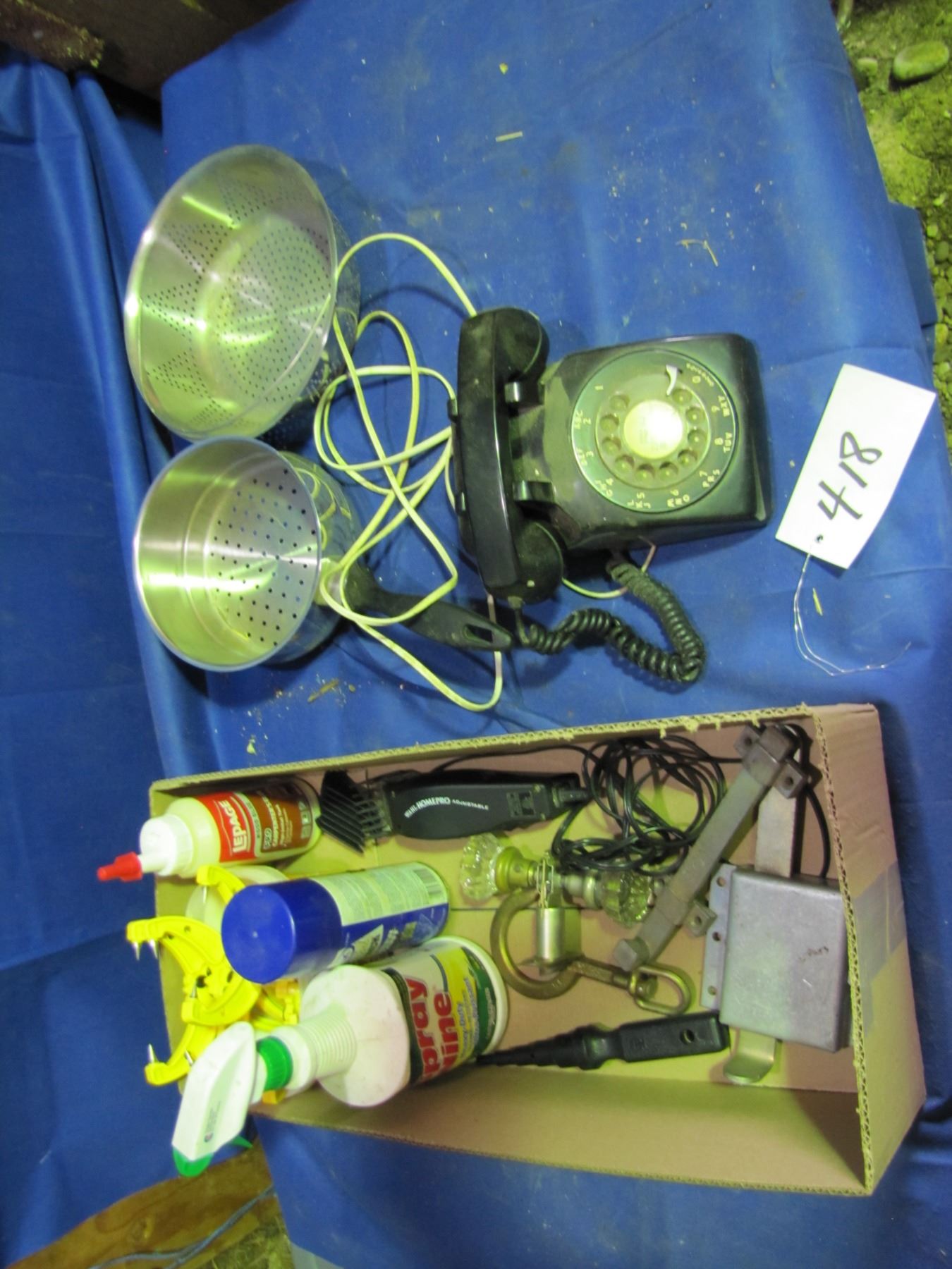 Rotary dial phone, misc door hardware, frame holders, spray nine, liquid wrench, strainers