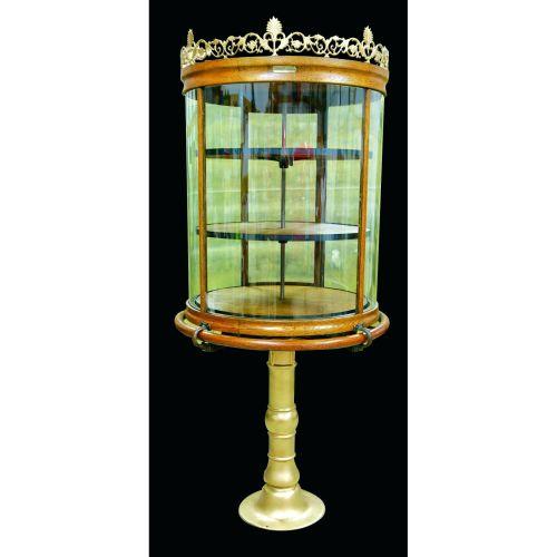 Rotating Drug Store Showcase from the Crystal Case Company, Alliance, OH. Patent 1889-97-1900. All original fish eyed glass, one piece of top fence recast, wood has been restored, original hardware and base. The best we have ever seen. 36 X 72 inches.