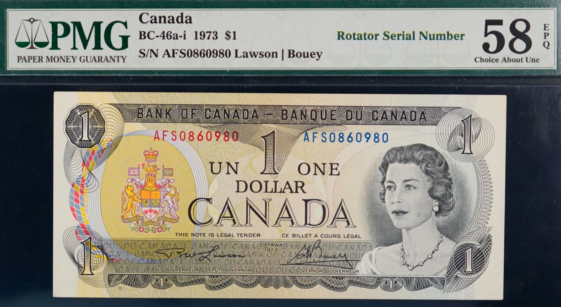 Rotator; 1973 $1 BC-46a-i #AFS0860980 PMG Choice About Uncirculated-58EPQ, Rotator serial number