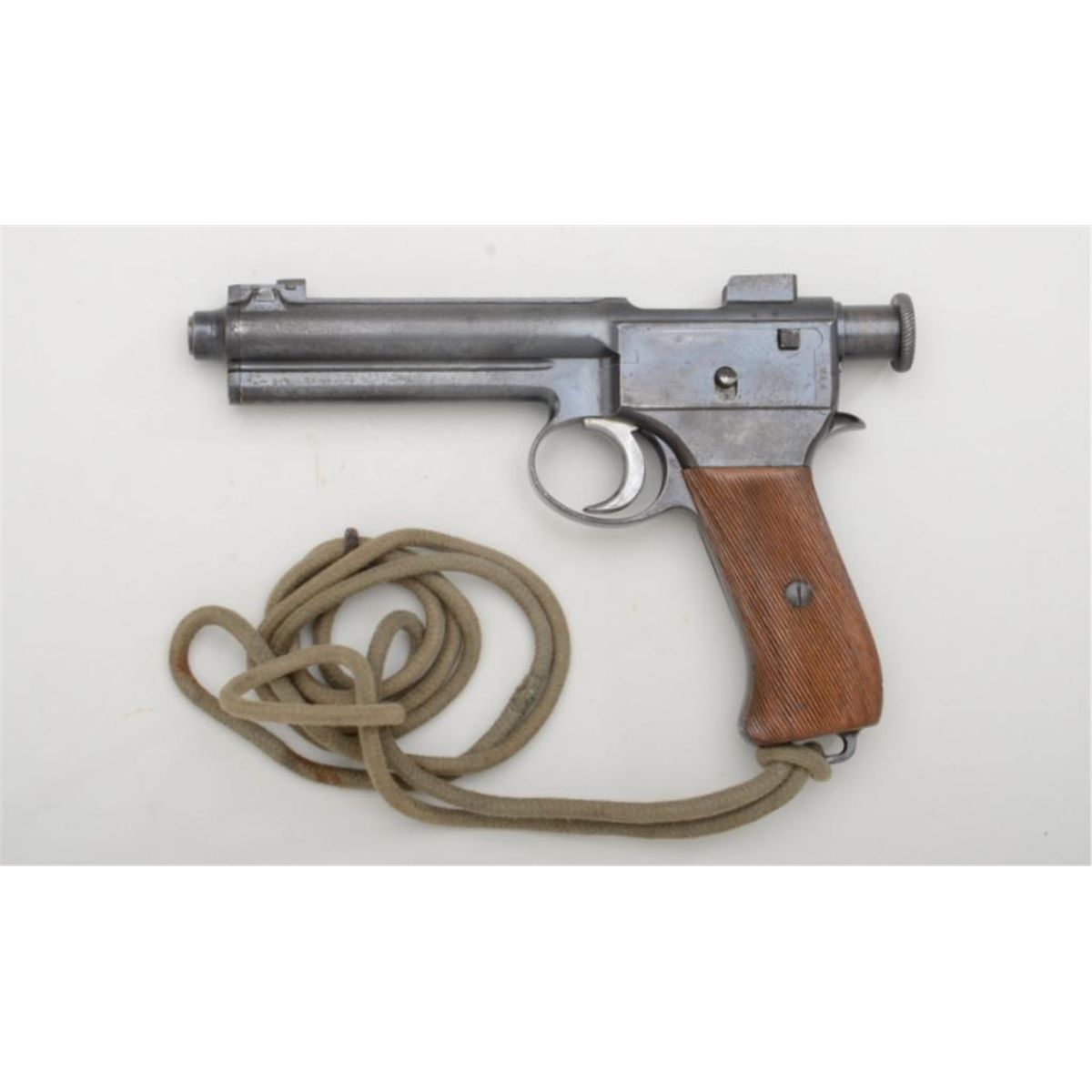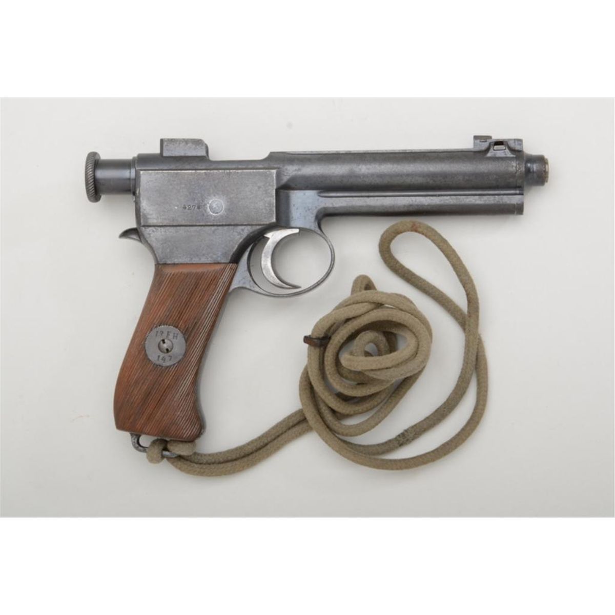 Roth Steyr Model 1907 semi-auto pistol, 8mm cal., 5-1/2” barrel, military blue finish, grooved wood grips, woven lanyard, #4274. This gun is in overall very good to fine condition showing considerable blue finish,some scattered pin prick pitting with heavier light pitting at the muzzle; fine bore, crisp action, fine grips; the first self-loading pistol adopted by the Austro-Hungarian army. Est.: $500-$750.