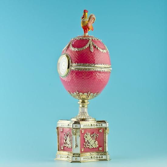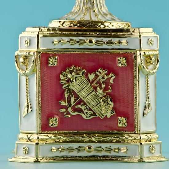 Rothschild Faberge Inspired Egg, measures 9 inches H X 3 in, materials Pewter, Enamel, Crystals. The Rothschild egg is a jewelled, enameled decorated egg made under the supervision of the Russian jeweller Peter Carl Faberge in 1902 by the workshop of Michael Perchin, for Beatrice Ephrussi de Rothschild, who presented the egg to Germaine Halphen upon her engagement to Beatrice's younger brother, Edouard Alphonse James de Rothschild.