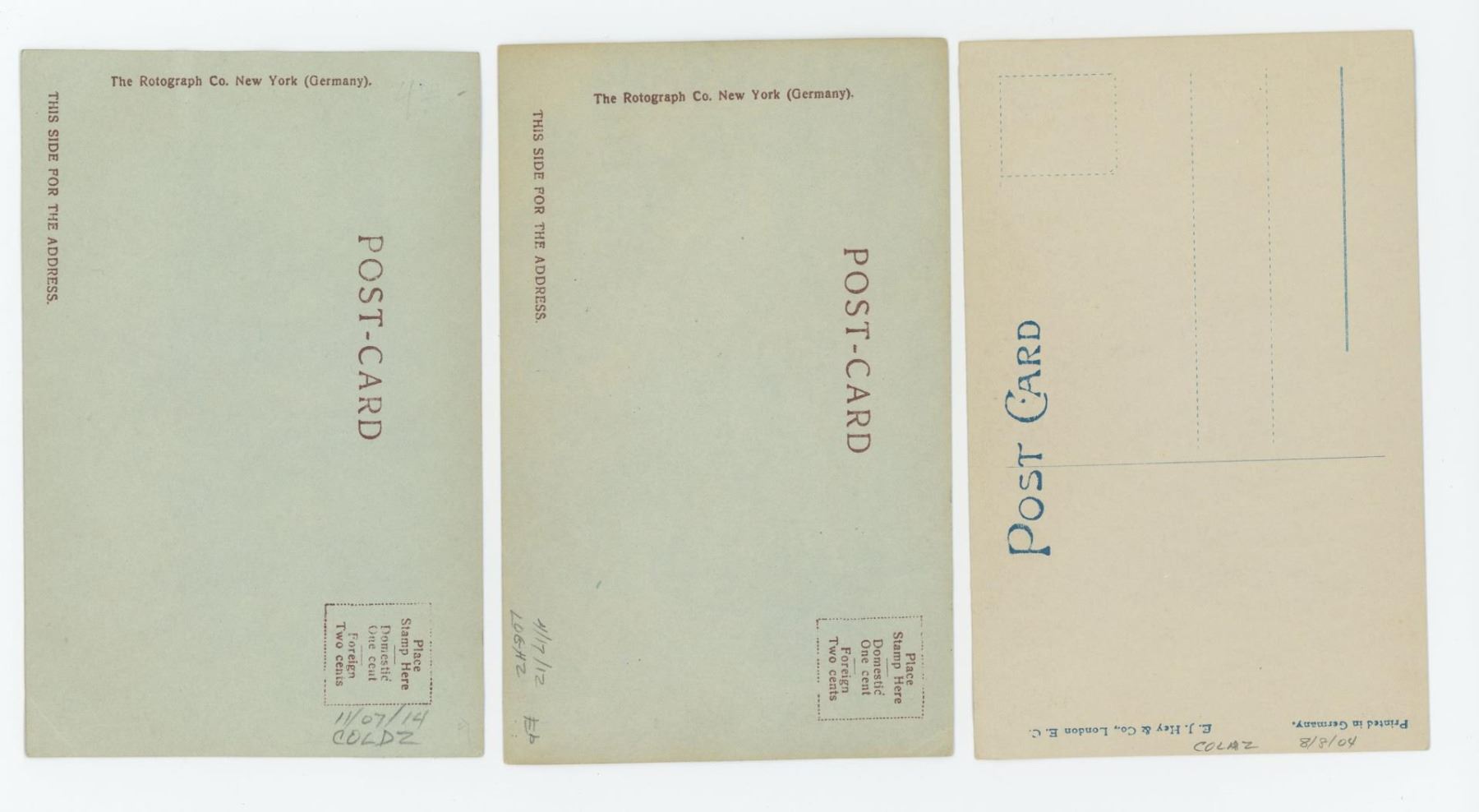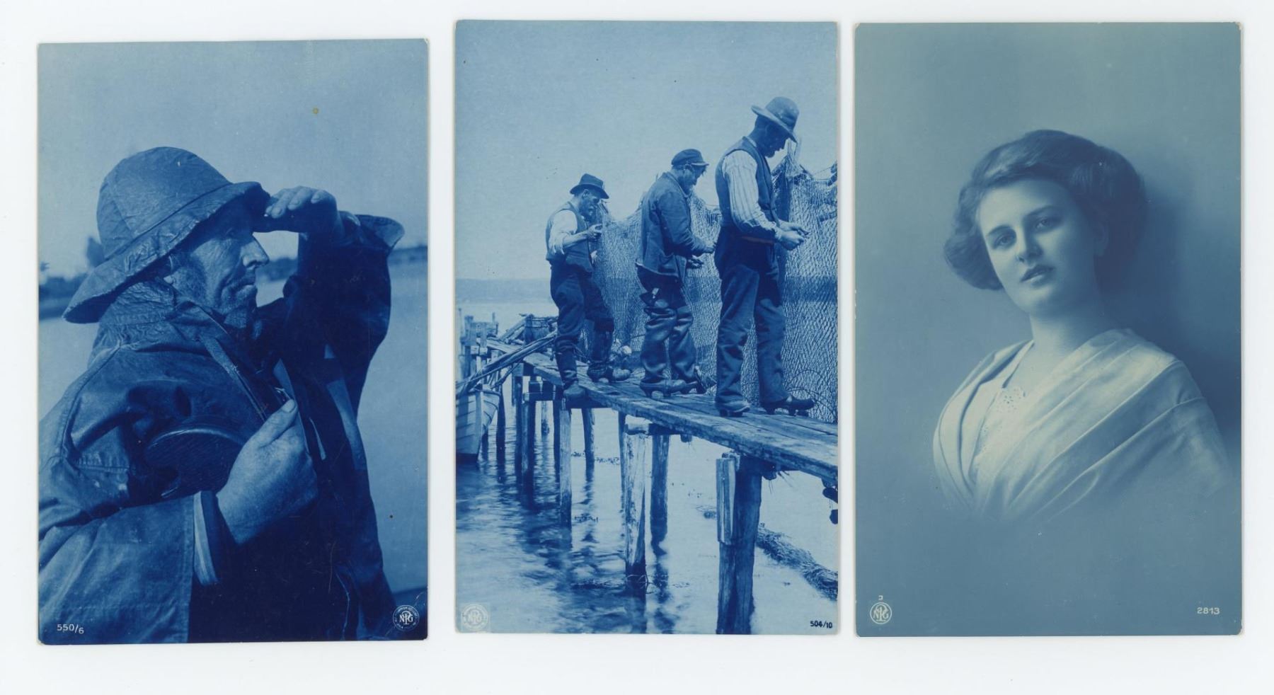 Nice group of cyanotype photograph post cards. Two of the three were produced by The Rotograph Company of New York and had images of Fishermen. All 3 were printed in Germany.
