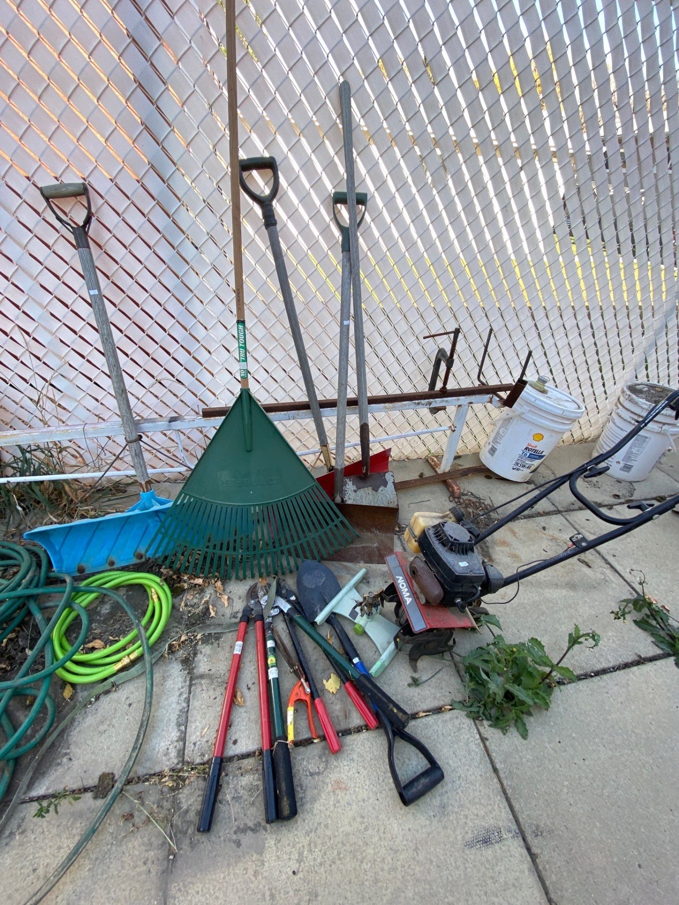 Rototiller and various garden items, including shovels and hoses garbage can and hand made aerator
