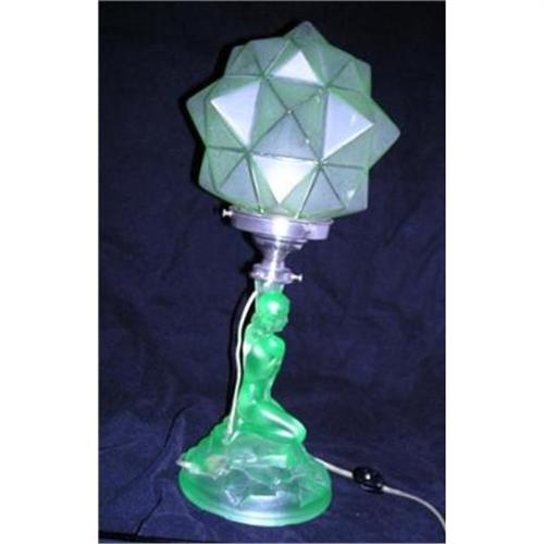 </font></strong>DESCRIPTION: Very desirable green uranium glass lamp base depicting long hair nude lady, draped cloth on her knees and rocks, and holding lamp fittings like an urn or a torch. The green glass fluoresces brightly with a black light (ultraviolet light). <p>Lamp has been recently rewired and works perfectly. <p>Hexagonal or geometric glass shade is The shade is 7 1/4 inches x 7 inches with a 3 3/16 fitter opening. This shade may also be used with Frankart or Nuart type lamps. This shade IS uranium glass and fluoresces brightly with blacklight. It may also be purchased separately.<p>The lamp retains its original screw shade fittings. <p>CONDITION: Very good condition. Only very tiny nicks at lowest cord hole. shade seems perfect, I have found no flaws in it, though it is very old.<p>SIZE: 10" height includes top of bulb fitting area, so add shade size to that dimension, making the lamp stand approx. 13".</font>