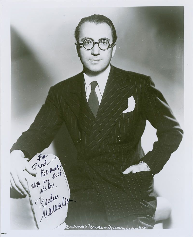 Armenian-American film and theatre director (1897–1987). Glossy 7.75 x 9.75 photo, of the director in a pin-striped suit, signed and inscribed in black felt tip “For Fred Bomar—With my best wishes, Rouben Mamoulian.” In fine condition.
