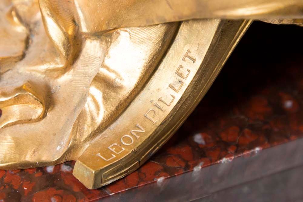 French. Bronze figure of female with shield. Leon Pillet - clock Maudemain Etampes. Approx. 28" H x 17 1/2" W.