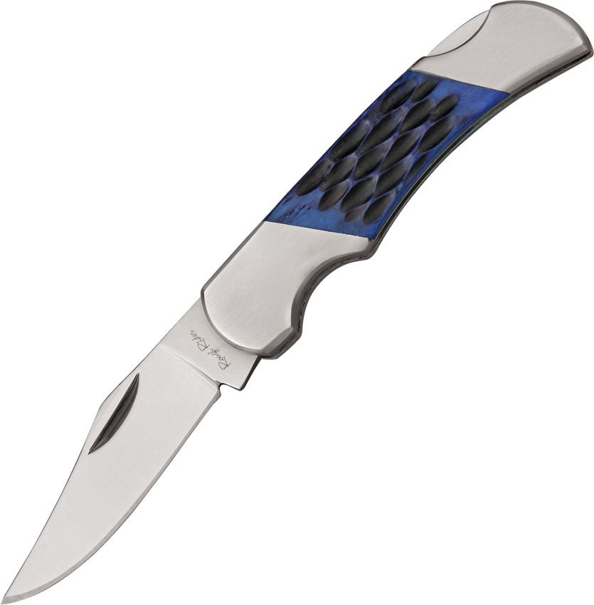 2 7/8" closed lockback. 2 1/8" stainless clip blade. Blue jigged bone handles with nickel silver bolsters