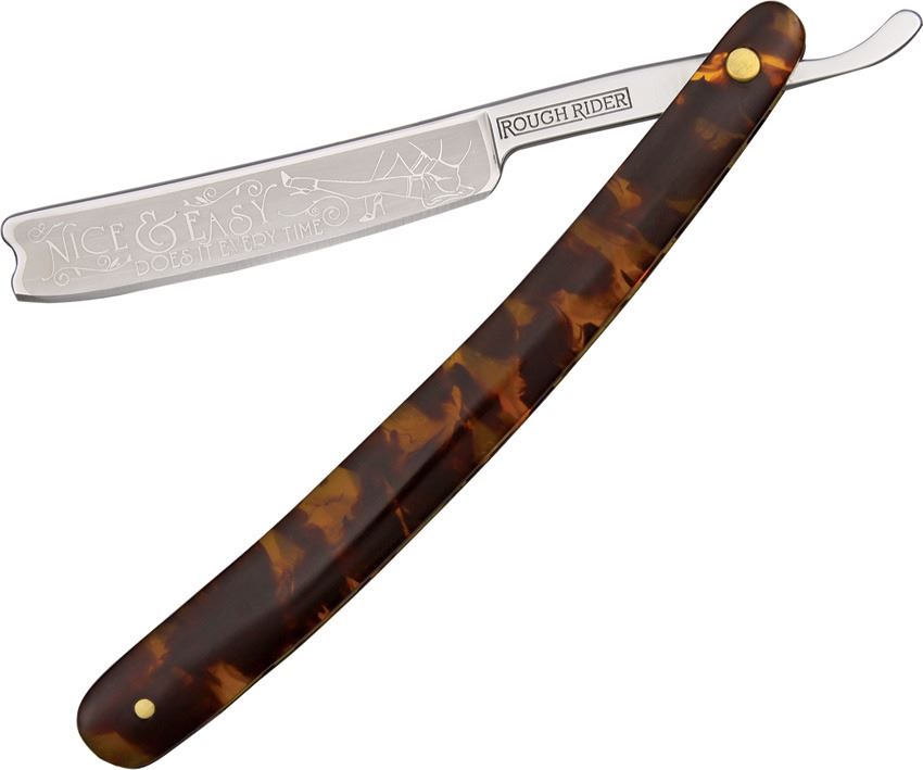Razor - Collector's Edition Straight Razor Series. 6 1/2" closed. 440 stainless razor blade with "Nice and Easy" frosted blade etch. Imitation tortoise shell celluloid handles.