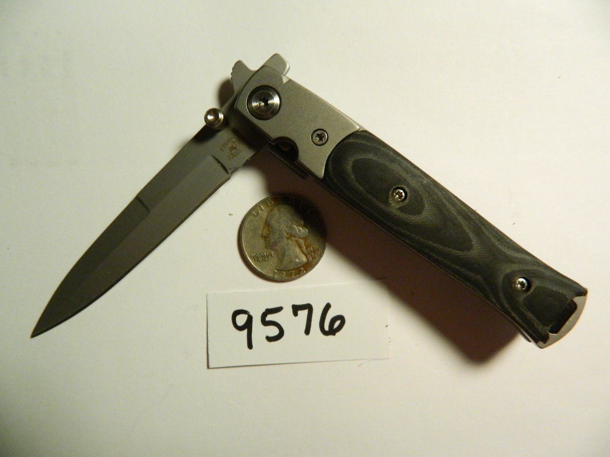 Stiletto - 4 1/8" closed linerlock. 3 1/8" matte finish stainless stiletto blade with false top edge, thumb stud and extended tang. Black micarta handles with matte finish stainless bolster. Matte finish stainless pocket clip.