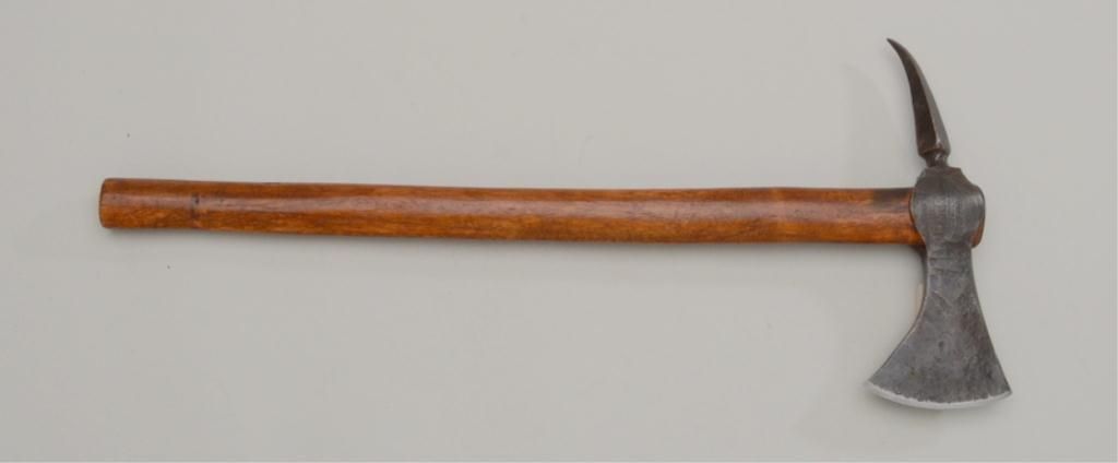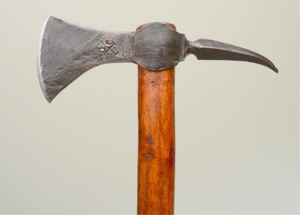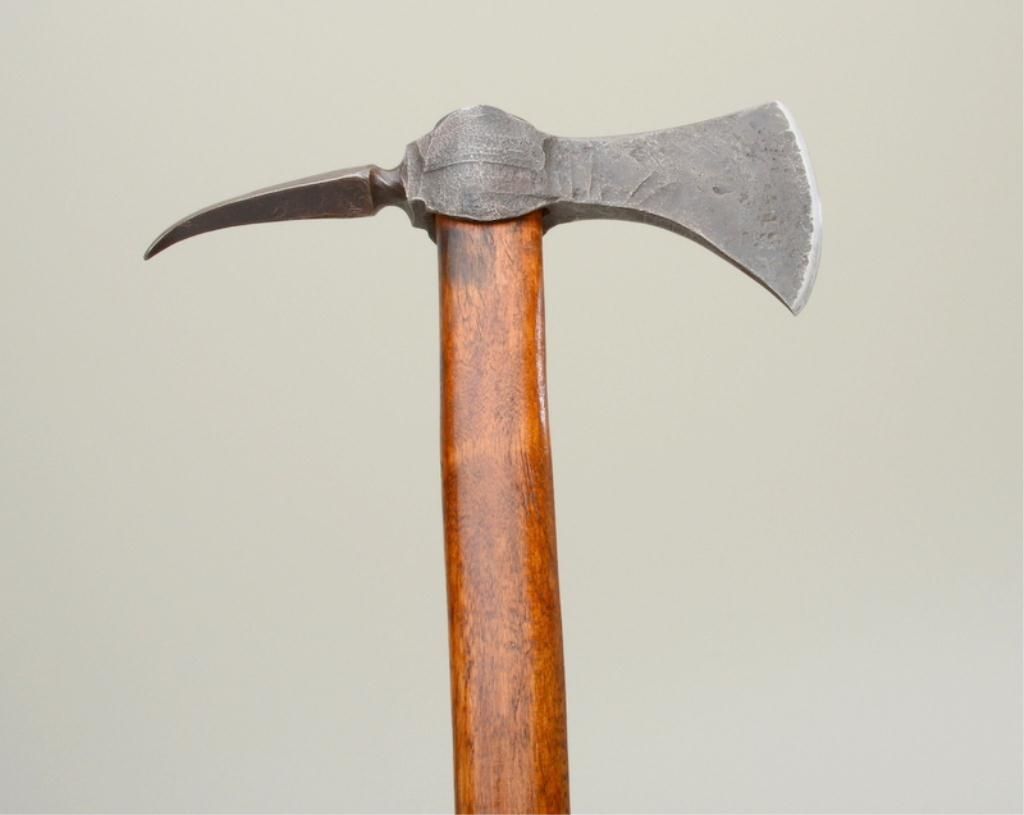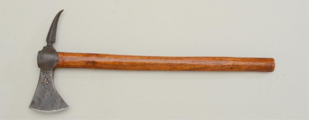 Roughly cast iron axe head with crossed stamping and initials “J” and “D” showing some age and dark patina with sharpening of the blade; more modern wood shaft; an interesting piece that may be researchable.Est.: $300-$600.