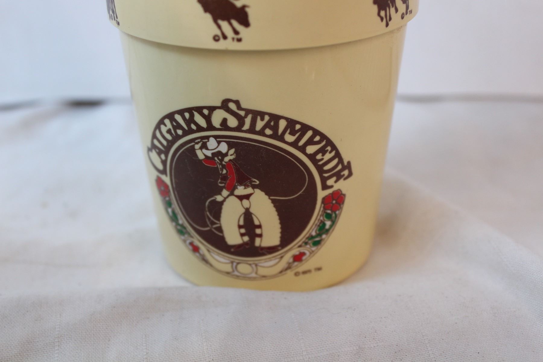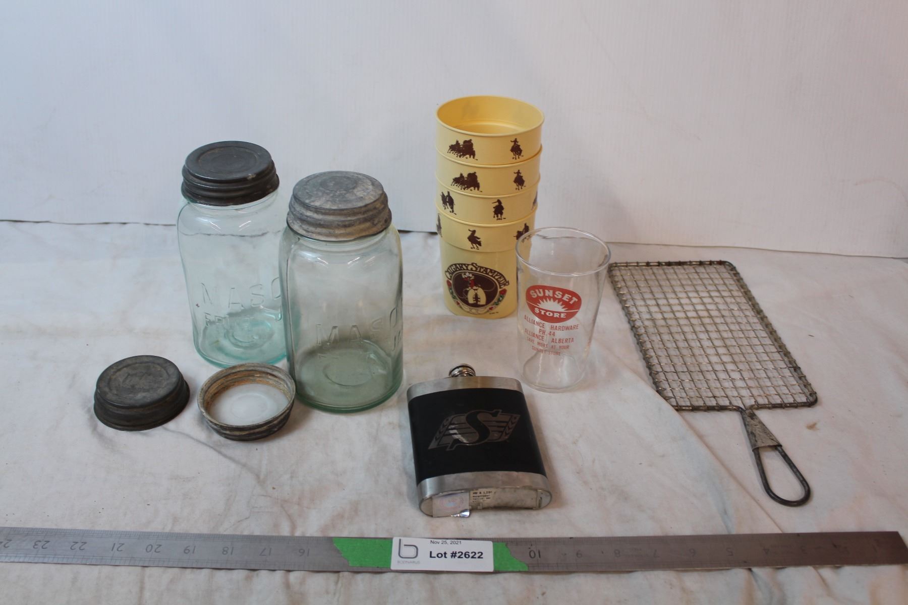 Roughrider flask, Calgary stampede cups, vintage mason jars, misc