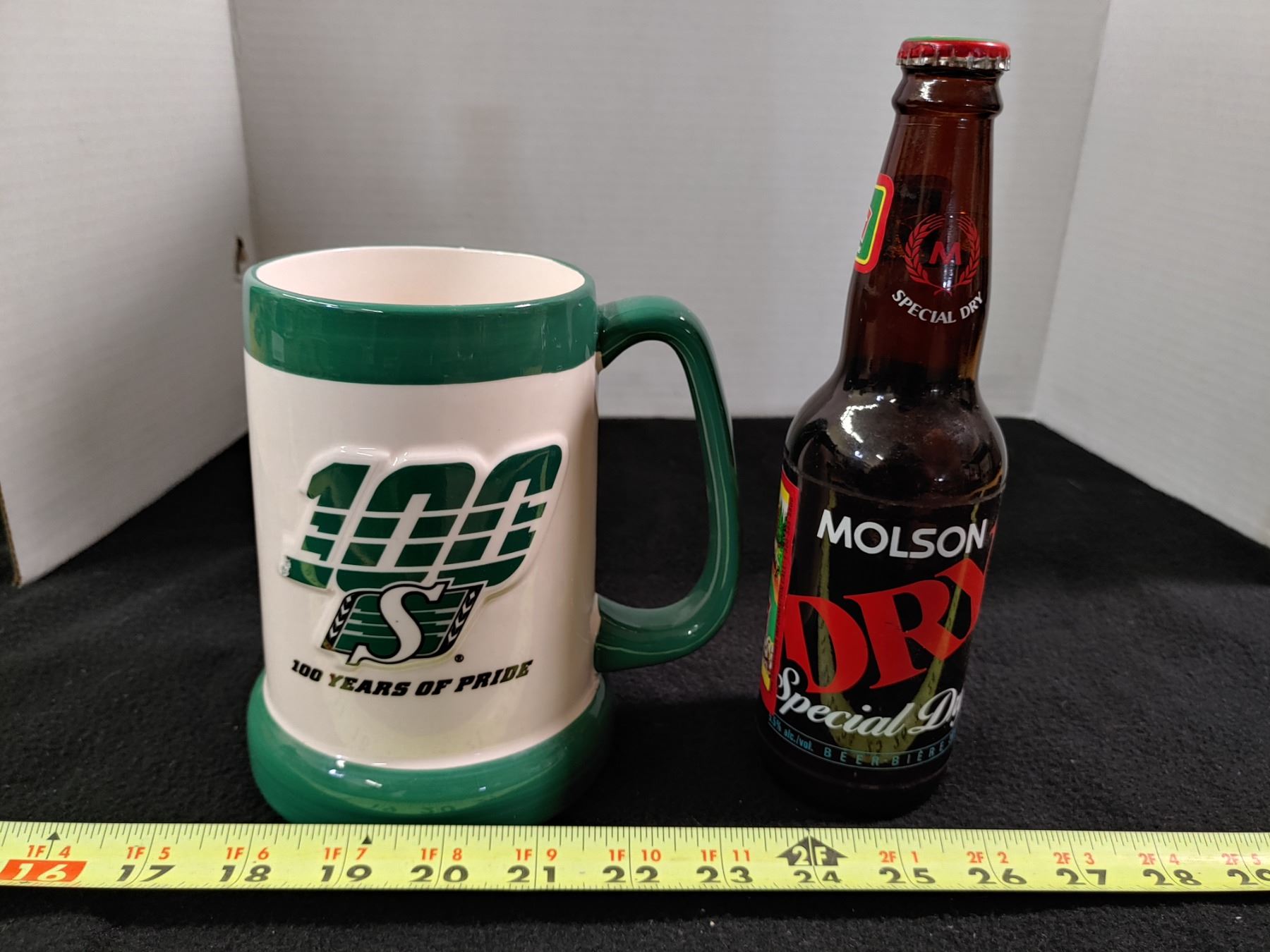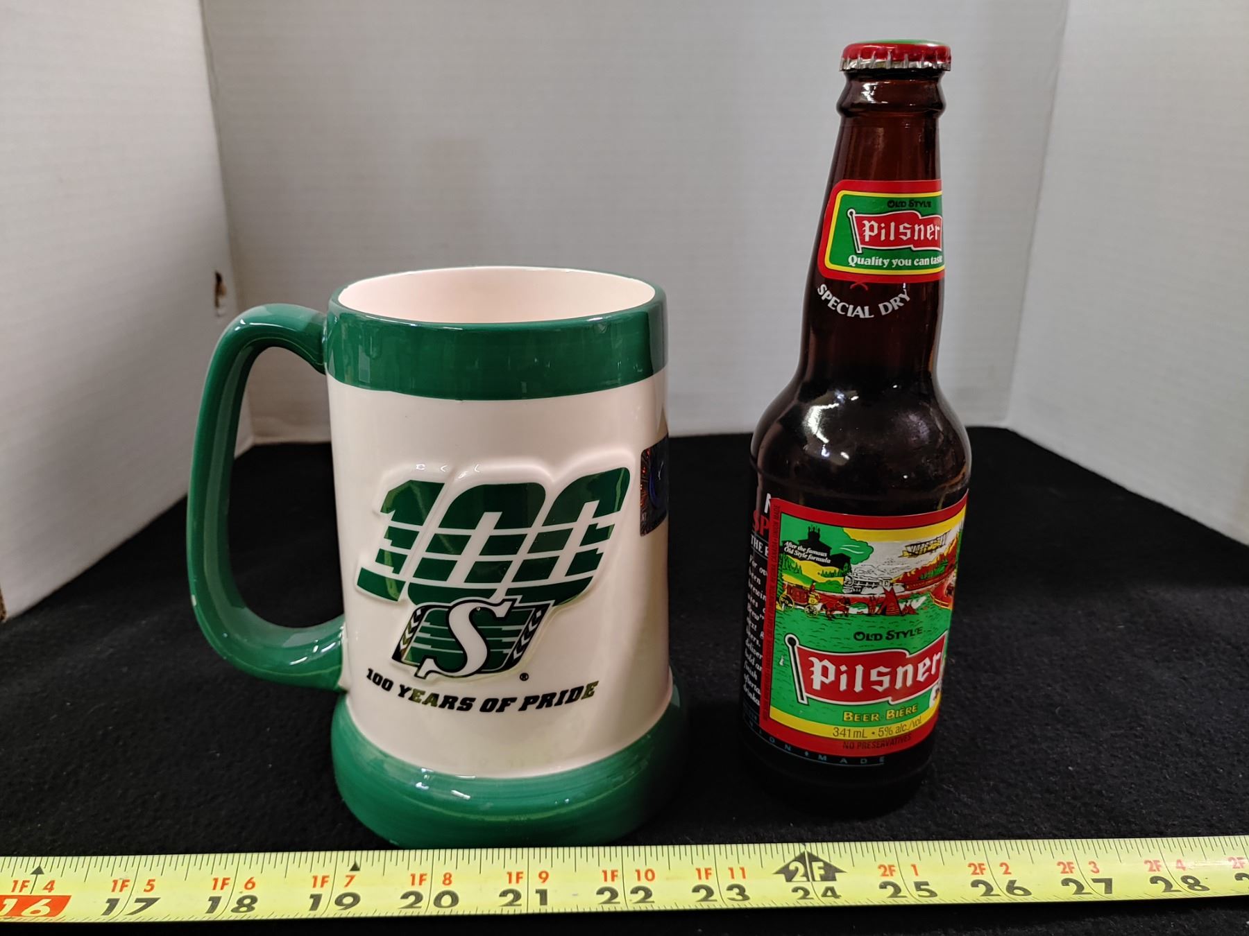 Roughriders 100 Year Beer Mug and Double Labeled Pilsner Bottle