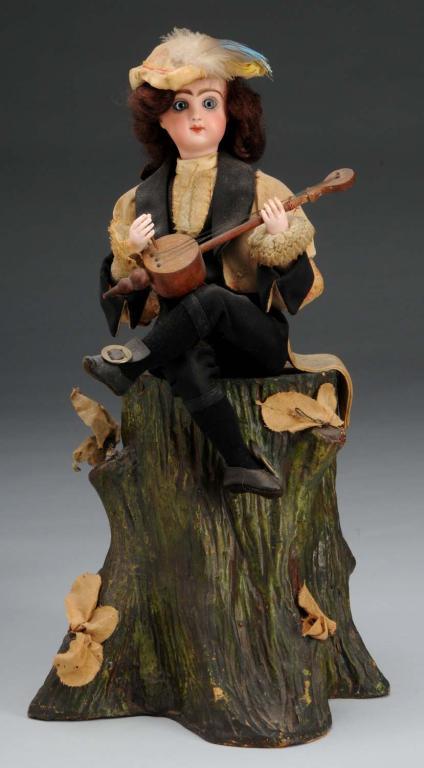 Description French. Circa 1890. Jumeau poured bisque socket head with red artists marks, blue paperweight eyes, finely painted brows and lashes, closed mouth, pierced ears, curly brown wig over kid with cork pate, and bisque hands holding a banjo and pick. Wearing original floral silk and lace suit with tails. Seated on a molded papier mache tree stump containing musical clockwork mechanism. When operated the figure moved head up, down, left and right, while strumming his instrument. Condition (Very Good - Excellent). Size 15 - 1/2" T.