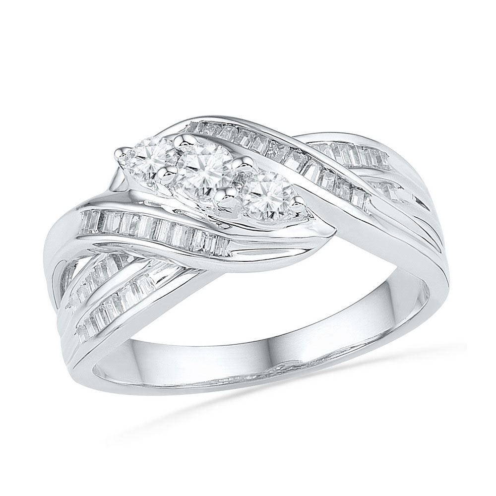 REF-47A3V - SKU: GD101872 ---- Round Baguette Diamond 3-Stone Crossover Band Ring 1/2 Cttw 10kt White Gold