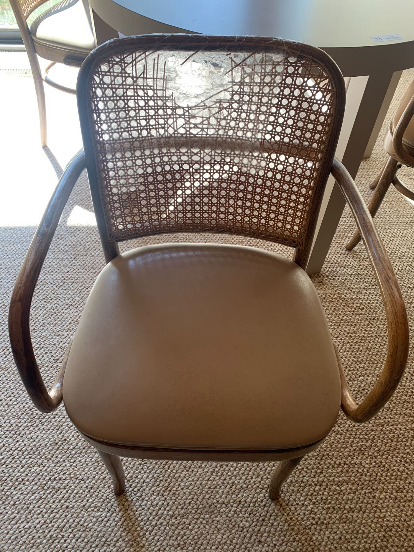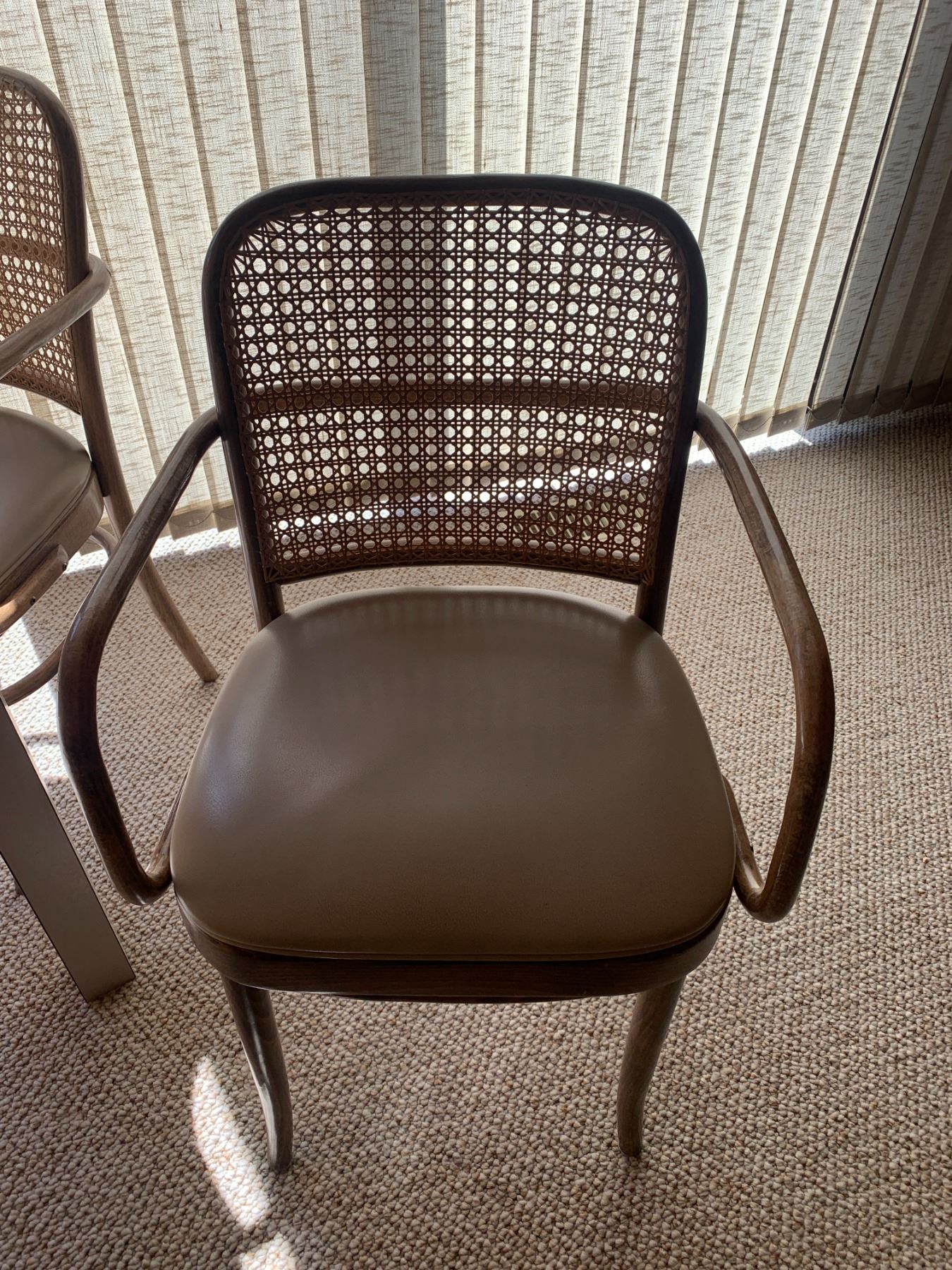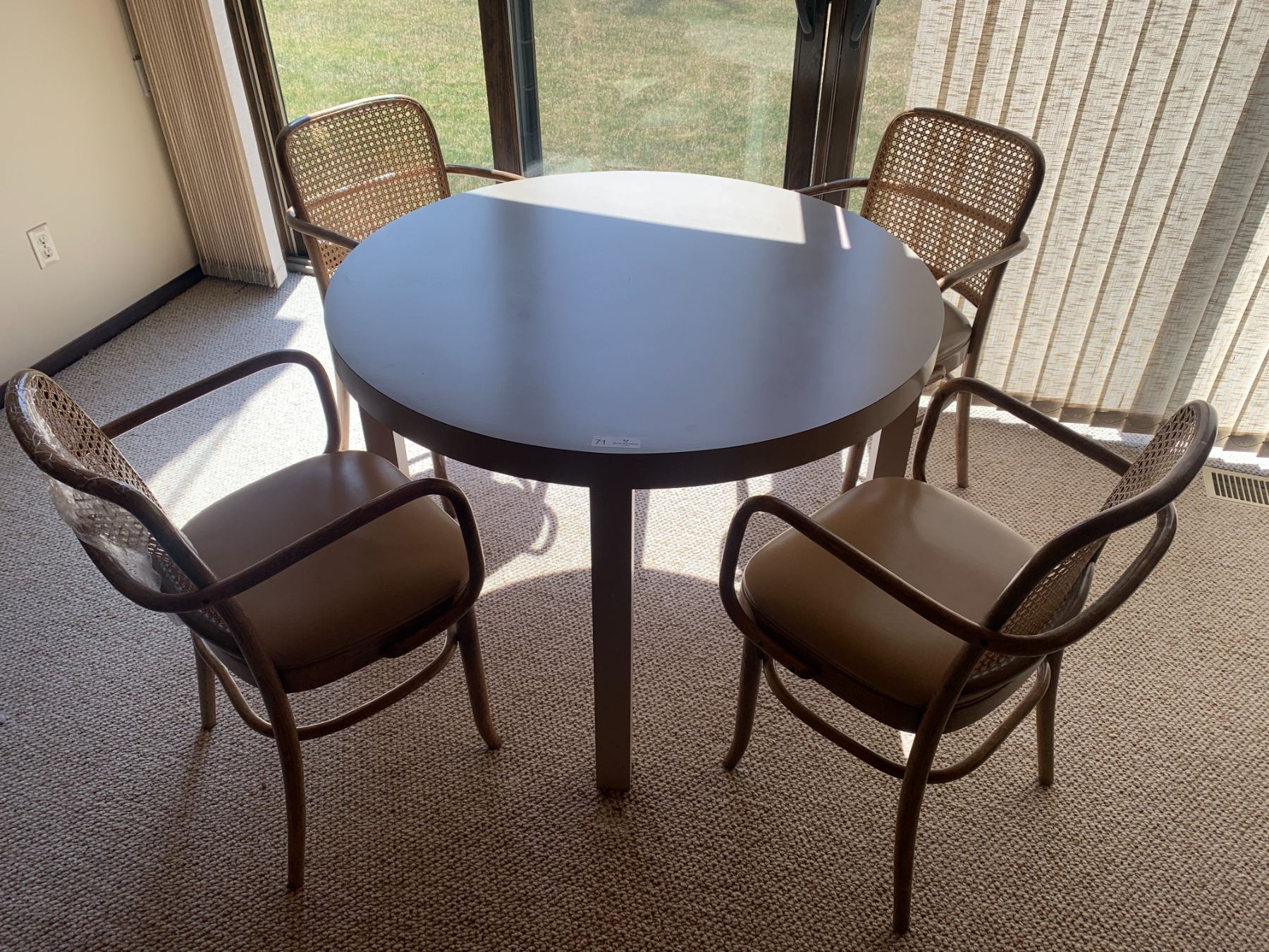 Round Beige Dining Table With Four Wooden-Framed Rattan Chairs