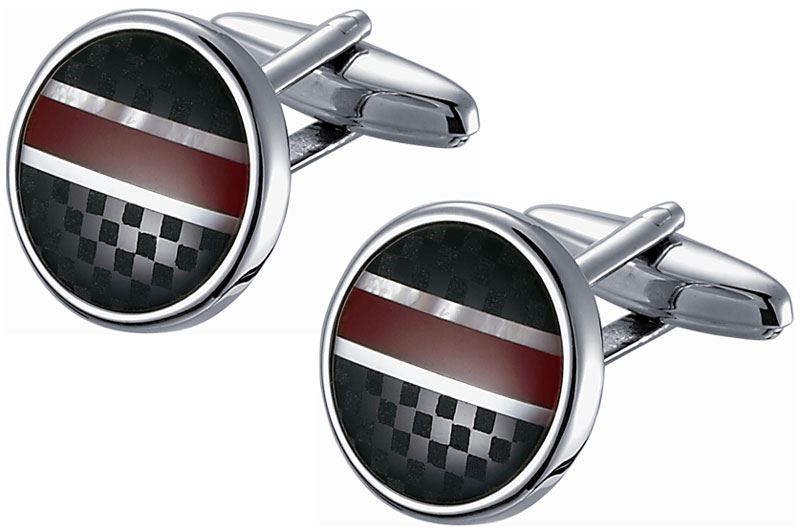 Round Black Checkered and Red Striped Stainless Steel C **|**|** Round Black Checkered and Red Striped Stainless Steel Cufflinks