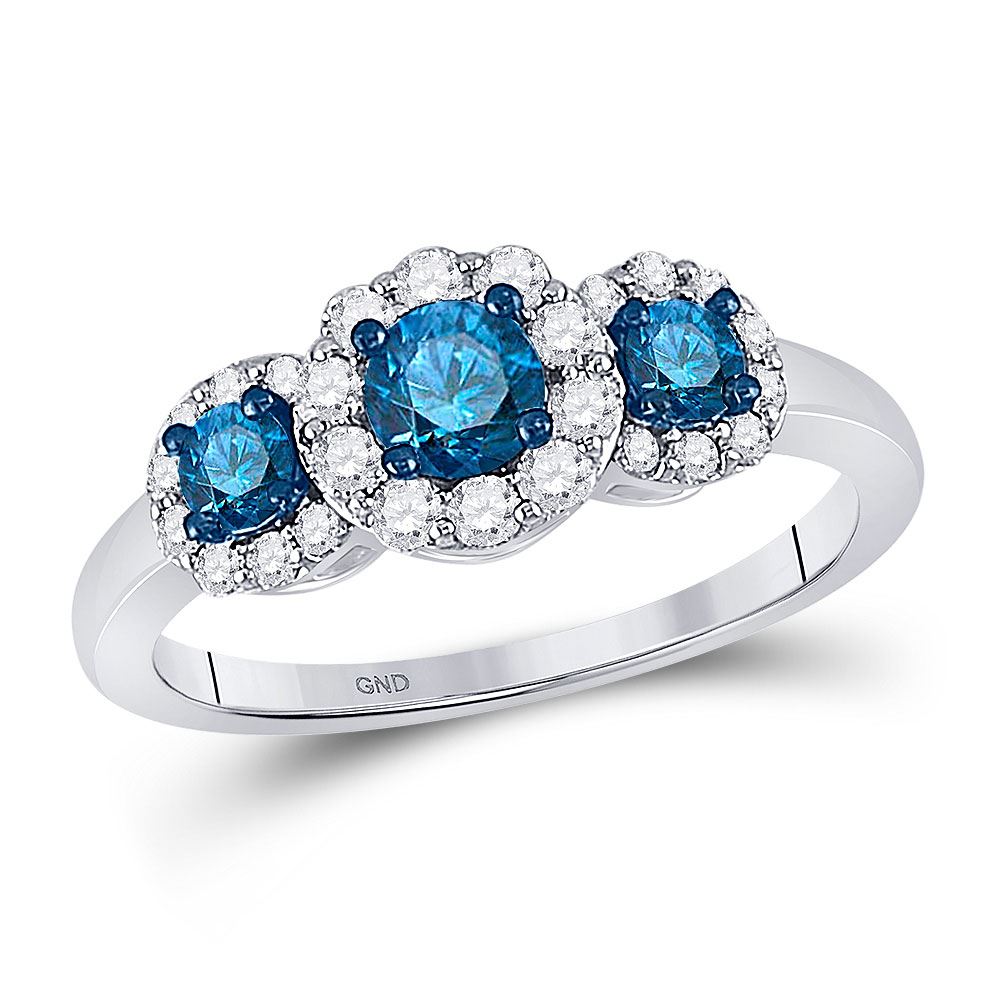 REF-45Y5N ---- Round Blue Color Enhanced Diamond 3-stone Bridal Wedding Ring 1 Cttw 10kt White Gold