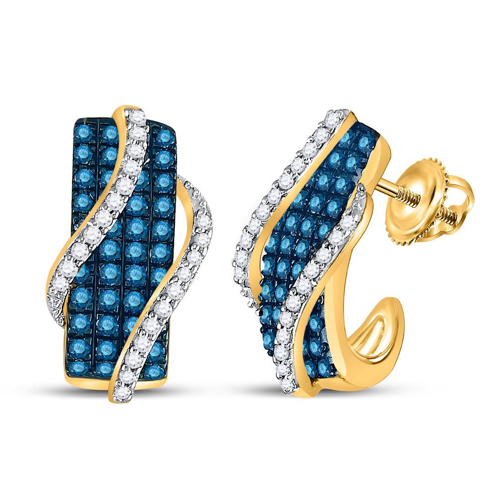 10kt Yellow Gold Womens Round Blue Color Enhanced Diamond Half J Hoop Earrings 1 Cttw.