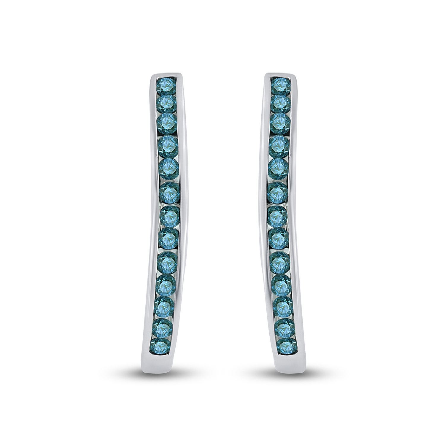 Round Blue Color Enhanced Diamond Hoop Earrings 1/4 Cttw 10KT White Gold