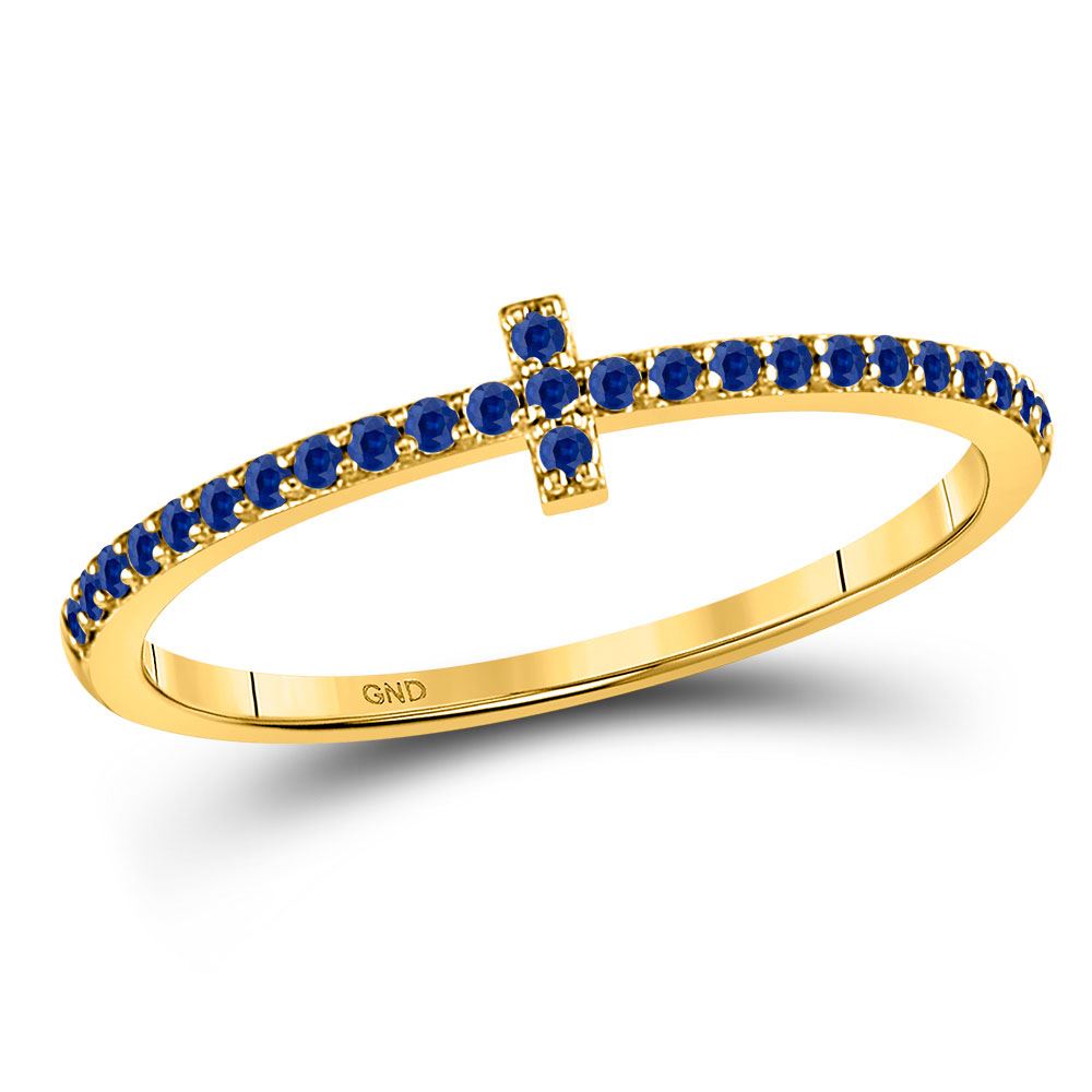 REF-11M8X - SKU: GD127721 ---- Round Blue Sapphire Cross Stackable Band Ring 1/6 Cttw 10kt Yellow Gold