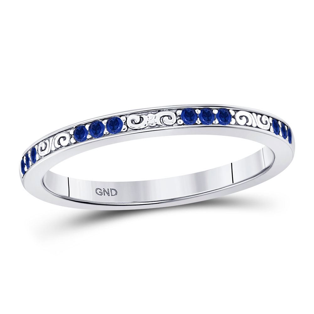 REF-13A6V - SKU: GD128036 ---- Round Blue Sapphire Flourished Stackable Band Ring 1/6 Cttw 10kt White Gold