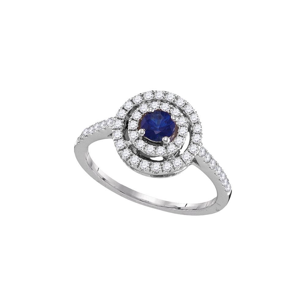REF-110R9K - SKU: GD103557 ---- Round Blue Sapphire Solitaire Concentric Circle Frame Ring 5/8 Cttw 18kt White Gold