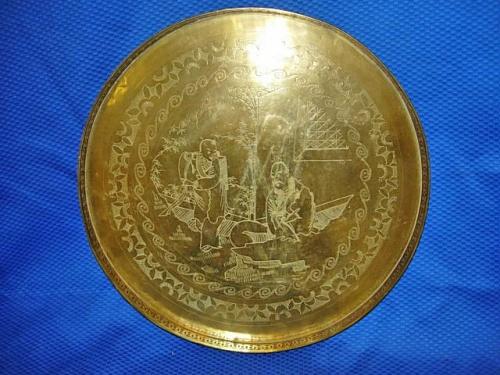 Round Chinese Brass Footed Tray, depicting Oriental Couple in a Garden, measures 12" d. *noting normal wear