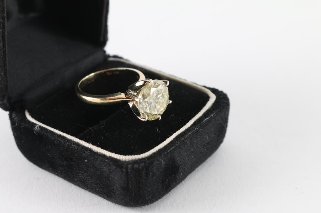 Nearly 5CT (4.91 estimated WT) measuring 11mm x 6.71 in depth. Graded I-2 O.P color, cape or yellow range, thick girdle , mounted in tiffany style, set in 14k white gold in a 6 prong mount. With a copy of the examination report. By Lamerson jewelers, certified and gemologist, GIA registered jeweler in the American gem society. Total replacement value $20,707.