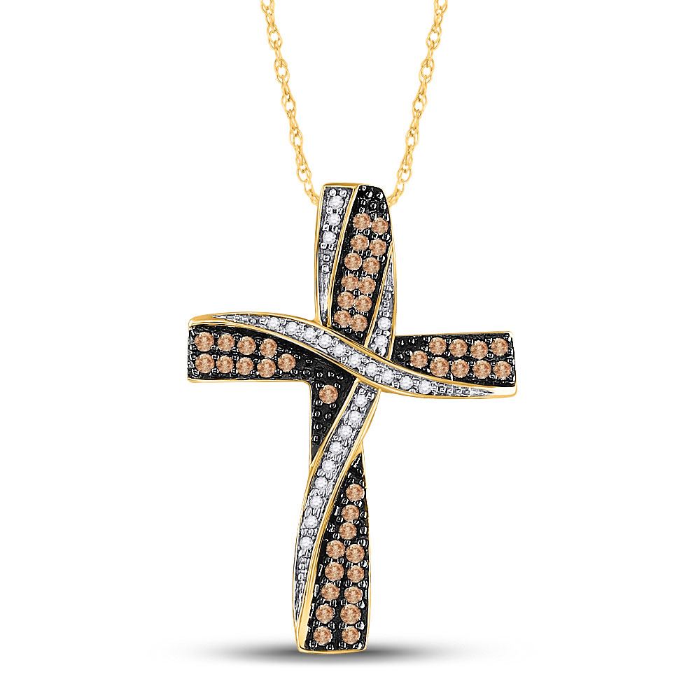 REF-39M1X - SKU: GD66777 ---- Round Brown Diamond Bound Cross Pendant 1/2 Cttw 14kt Yellow Gold
