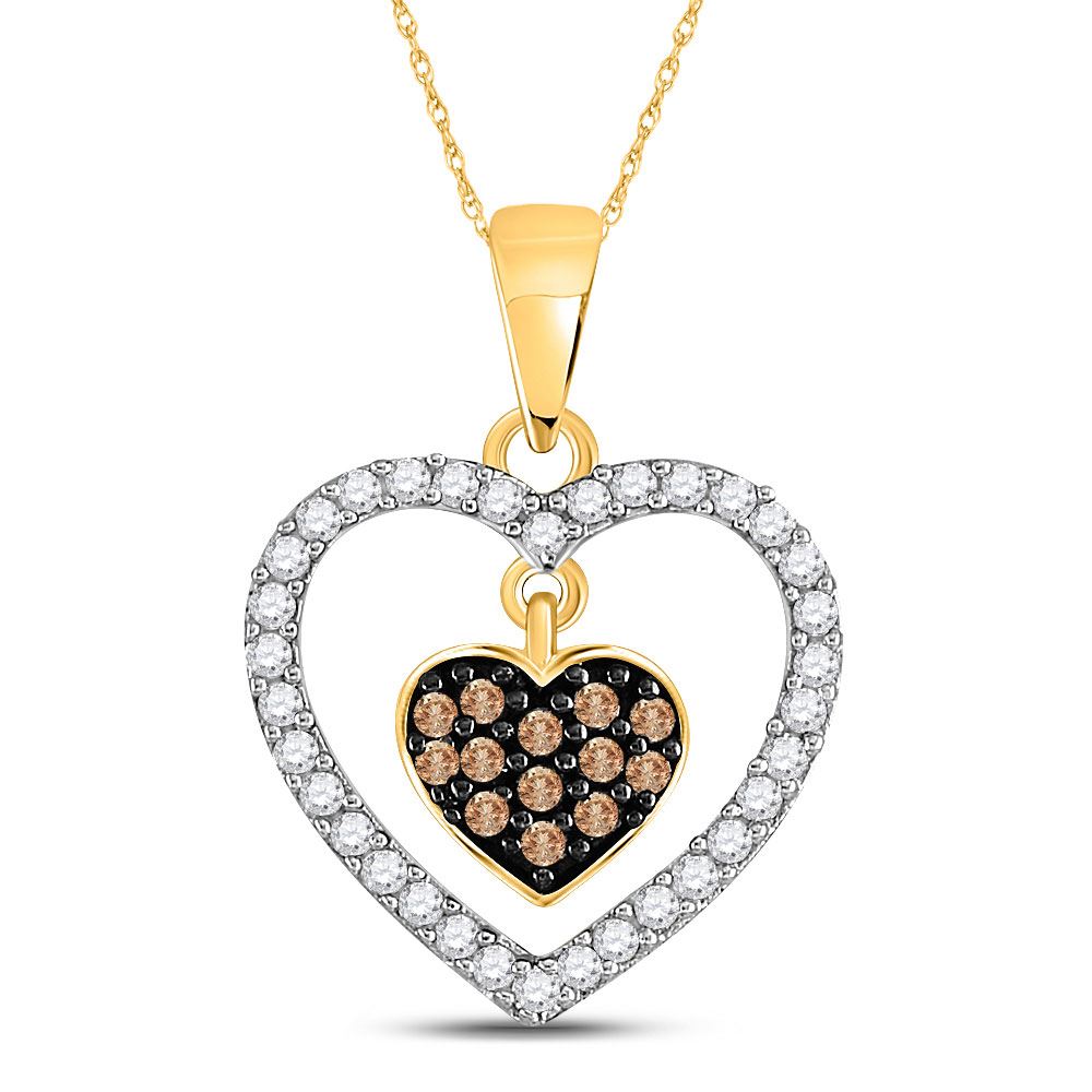 Round Brown Diamond Nested Dangle Heart Pendant 1/3 Cttw 10KT Yellow Gold
