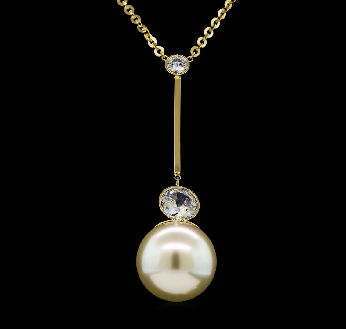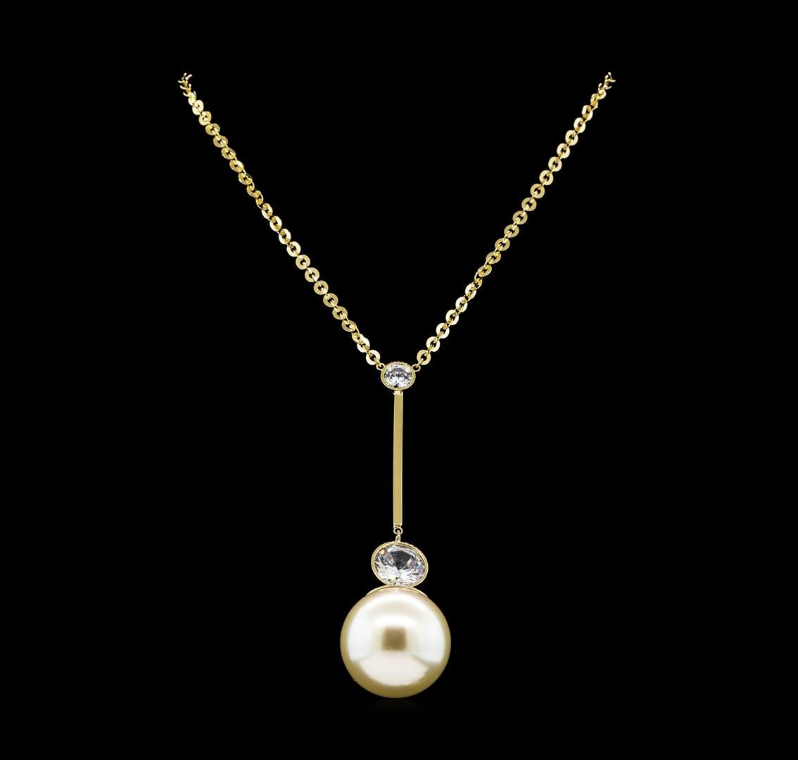 High end designer jewelry. Round Crystal Bezel Pearl Necklace - Gold Plated. Gold Plated Chain. Gold/ White. 20/2.5inches.