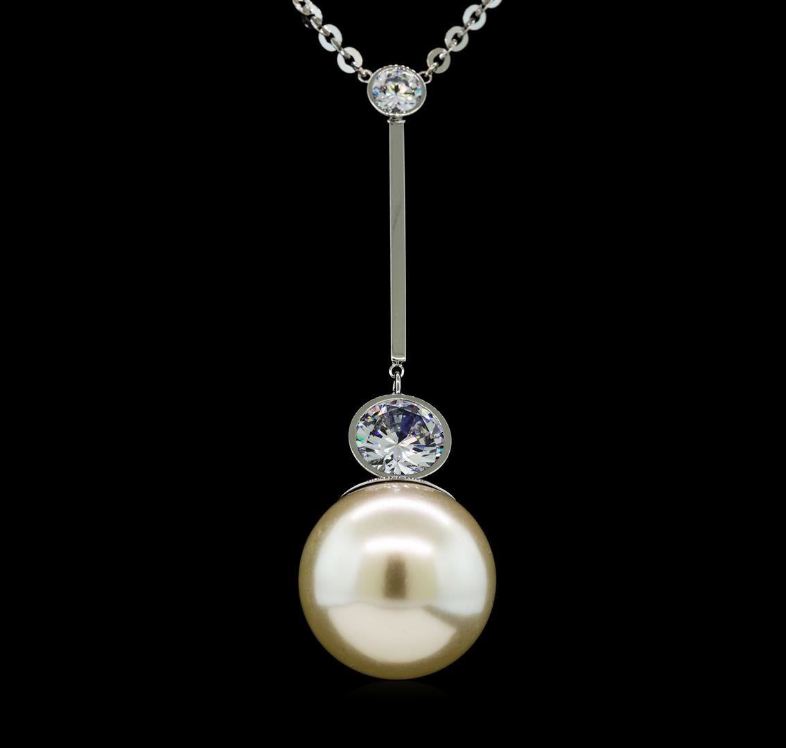 High end designer jewelry. Round Crystal Bezel Pearl Necklace - Silver Plated. Silver Plated Chain. Silver/ White. 20/2.5inches.