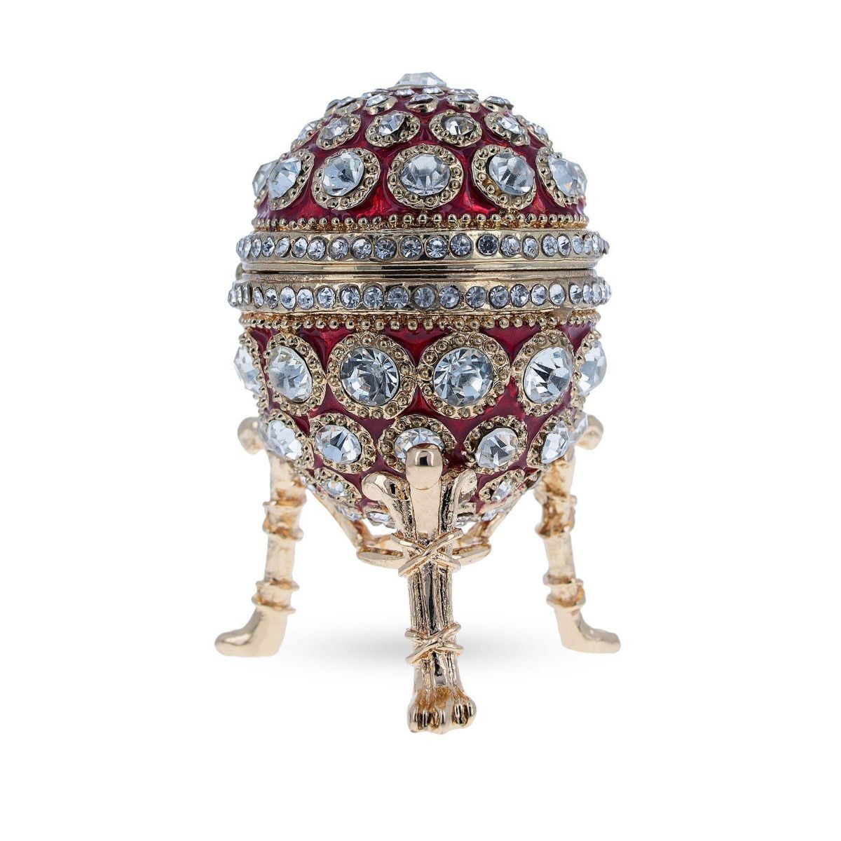 Inspired by the designs of Carl Faberge for the Russian Royal family, beautiful Russian hand-painted enamel & gilt over pewter with embedded Austrian crystals egg. The egg opens at center on a hinge, with magnetic closure, to reveal a hidden compartment for storing trinkets or jewels. Comes with gift box. 2 1/2" H X 2" W. Â